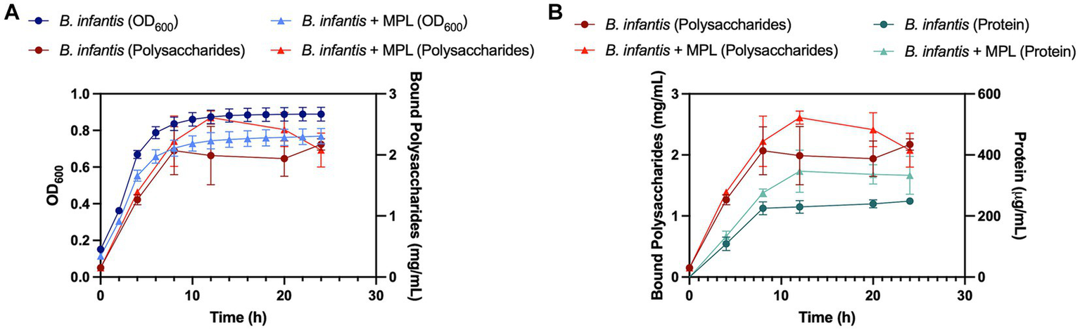 Figure 4. Growth (blue) and bound polysaccharide production (red) curves (A) for Bifidobacterium infantis with or without MPL treatment. Protein quantification (green) compared to bound polysaccharide production (red) curves (B) for B. infantis with or without MPL treatment. Experiments were conducted in triplicate.