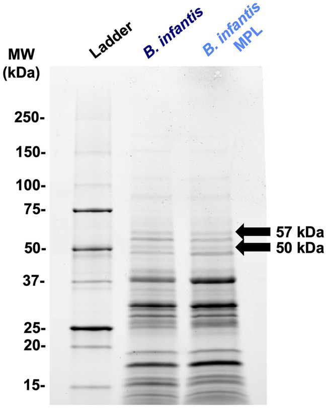The surface protein profile of B. infantis in response to MPL was visualized using SDS-PAGE by loading 30 μg protein per sample on a Mini-Protean TGX Stain-free gel (4–20%) and applying 90 V for 15 min followed by 180 V for 30 min. Five μL of Precision Plus Unstained Protein Standard was used as a reference. Gels were imaged using a ChemiDoc MP Imaging System and densitometric analyses of the gels were performed using Image Lab Version 6.1 to semi-quantitatively determine differences in bacterial surface proteins. All reagents and equipment used for gel electrophoresis were purchased from Bio-Rad. Bands with the greatest increase or decrease in expression (at least 2-fold change) were excised, digested in gel using trypsin, and sequenced using Capillary-LC/MS/MS at the Campus Chemical Instrument Center (CCIC) Mass Spectrometry and Proteomics Facility at OSU. Data were searched using Mascot Daemon by Matrix Science V2.7.0 (Boston, MA) via Proteome Discoverer V2.4 (Thermo Scientific) and the database searched against the most recent UniProt databases. A decoy database was also searched to determine the false discovery rate (FDR) and peptides were filtered accordingly at 1% FDR. Proteins identified with at least two unique peptides were considered as a reliable identification. The mass spectrometry proteomics data have been deposited to the ProteomeXchange Consortium via the PRIDE (31) partner repository with the dataset identifier PXD042186. Although the proteomics was not performed in replicates, we did run 3 independent replicates of the SDS-PAGE gels and the band patterns exhibited were compared using the BioRad ImageLab software. The two bands of interest to us were present in the 3 independent replicates with similar experimental molecular weight.