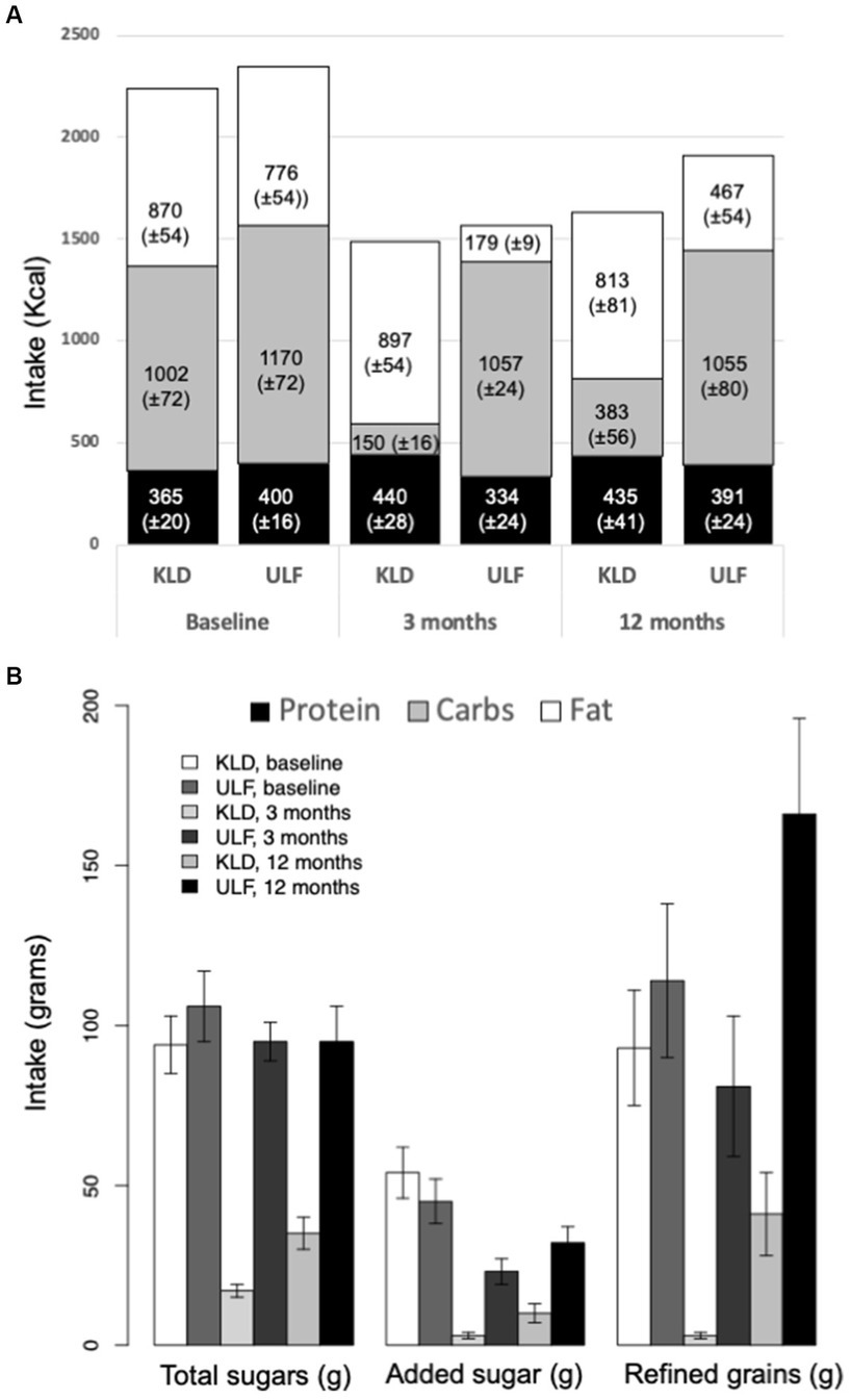 The KLD (n = 18) and ULF (n = 21) groups included participants exclusively from the HLC and HLF arms, respectively. There were no significant between-group differences in baseline demographic or anthropometric data and laboratory measurements (Table 1). Baseline daily intake of total calories, fats, protein and added sugars and refined grains was also similar between groups (Table 2). The ULF group reported a marginally significantly greater baseline daily intake of total carbohydrates compared to the KLD group (KLD: 250.4 ± 18.3; ULF: 292.4 ± 17.7 grams; p = 0.047). However, baseline daily intake of net carbohydrates (total carbohydrates minus fiber) was similar between the two groups.