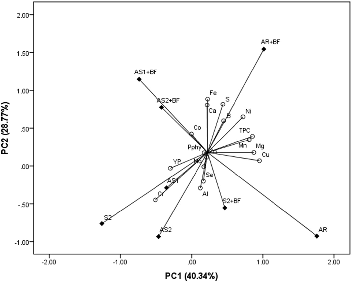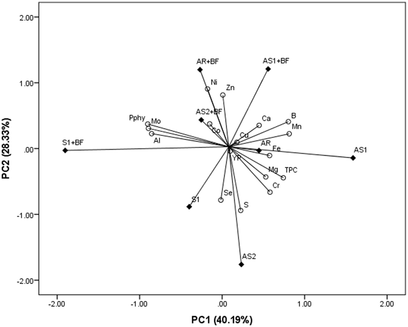 The obtained results were processed using analysis of variance (ANOVA). Means were tested by Fisher's least significant difference (LSD) at the significance level of p < 0.05. The molar ratios between phytic acid (PA) and essential elements (PA/Mg, PA/Ca, PA/Fe, and PA/Zn) were presented as a mean ± standard deviation (SD). Principal component analysis (PCA) was used to assess the interdependence among intercrop combinations and BF regarding grain composition, i.e., concentrations of Pphy, TPC, YP, and examined elements, using SPSS 15.0 (SPSS Inc., Chicago, IL) for Windows (36).