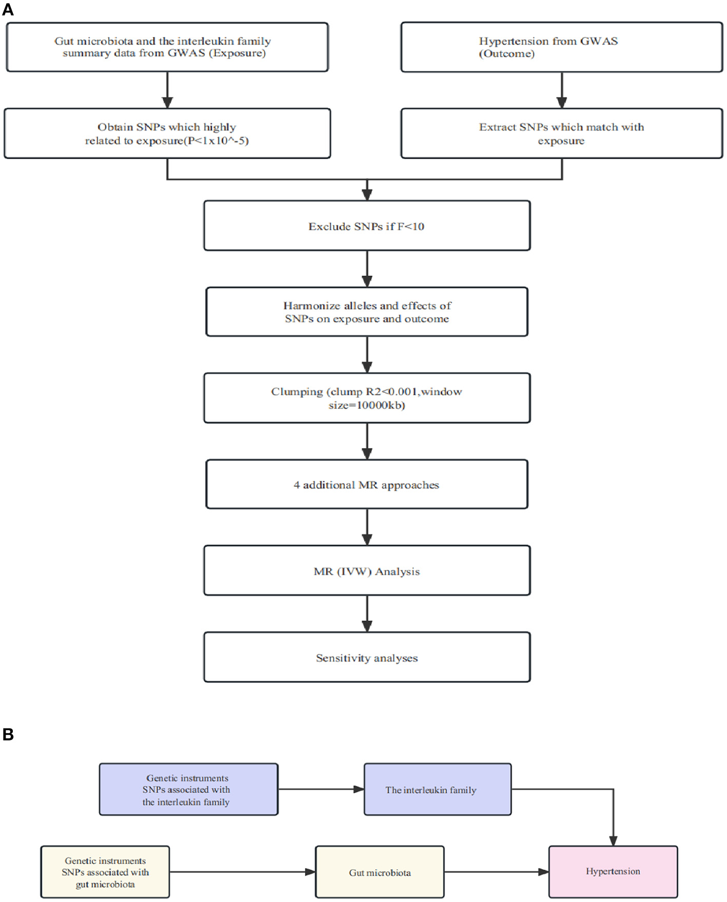 In order to obtain reliable results, a two-sample MR should satisfy three essential assumptions: (1) Instrumental variables (IVs) must be significantly associated with gut microorganisms; (2) IVs are not associated with other factors that could confound the relationship between exposure and outcome variables; (3) IVs should influence outcomes solely via the gut microorganisms. As depicted in the flowchart (Figure 1), our study first employed a two-sample MR to establish the causal relationship between specific gut flora and interleukin (IL)-related factors in relation to hypertension. Following this, we utilized a mediated MR (two-step MR) to delve into the causal link between specific gut flora, as mediated by interleukin-related factors, and hypertension.