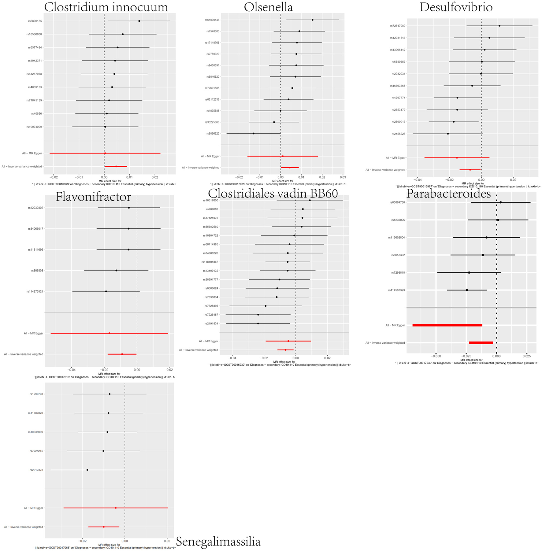 In our investigation of the effects of microbial taxa on hypertension, we identified a positive association between hypertension and two gut microbiota taxa—the genus Clostridium innocuum group (OR = 1.0047, 95% CI: 1.0004–1.0090, p = 0.0336) and the genus Olsenella (OR = 1.0044, 95%CI: 1.0001–1.0088, p = 0.0430). The results suggest their potential to heighten hypertension risk (Figure 2; Supplementary Figures S3–S5). Conversely, five gut microbiota taxa, including the genus Senegalimassilia (OR = 0.9901, 95%CI: 0.9830–0.9973, p = 0.0072), the genus Parabacteroides (OR = 0.9874, 95%CI: 0.9776–0.9972, p = 0.0121), the Clostridiales vadin BB60 group family (OR = 0.9936, 95%CI: 0.9886–0.9986, p = 0.0125), the genus Desulfovibrio (OR = 0.9929, 95%CI: 0.9864–0.9995, p = 0.0342), and the genus Flavonifractor (OR = 0.9909, 95%CI: 0.9823–0.9997, p = 0.0416), were linked to a diminished hypertension risk, suggesting their possible antihypertensive properties (Figure 2; Supplementary Figures S3–S5). To validate the aforementioned results, we conducted a sensitivity analysis using the MR-Egger, weighted median, simple mode, and weighted mode methods (Supplementary Figure S6).