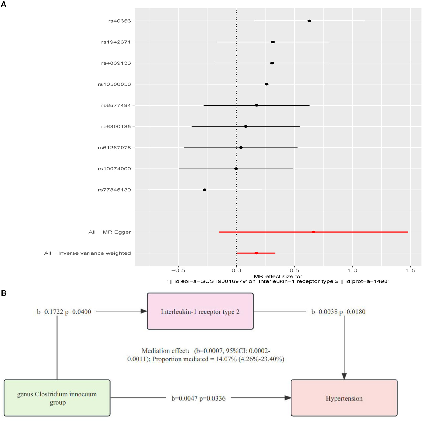 Figure 4. (A) Analysis of the causative relationship from Clostridium innocuum group to IL-1R2 (P < 1.00E-05). (B) Depiction of the role of interleukin-1 receptor type 2 in mediating the causal effect of gut microbiota on hypertension, with MR estimates for the connection among interleukin-1 receptor type 2, gut microbiome, and hypertension provided via the inverse variance-weighted approach.