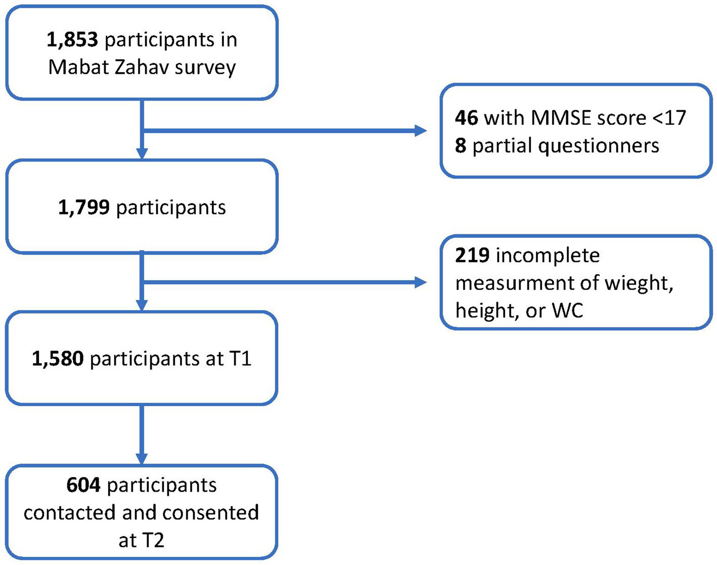 In our study we examined the predictive role of a new anthropometric measurement ABSI in the development of frailty and mortality incidence, using a cohort study design. The study was based on the First Israeli National Health and Nutrition Survey of Older Adults (“Mabat Zahav”) that was conducted from July 2005 to December 2006 (time 1 [T1]). The survey population consisted of 1,853 community-dwelling participants aged 65 and above; data collection included information regarding health and nutrition status, functional and cognitive function, and anthropometric measurements. The survey was carried out by the Israel Center for Disease Control (ICDC) and the Nutrition Department of the Israel Ministry of Health (MOH). After excluding participants with low Mini-Mental State Exam (MMSE) (21) scores and incomplete questionnaires, the final study population at T1 consisted of 1,799 participants, of whom 1,580 participants had complete weight, height, and WC data. From May 2017 to June 2019, after a median duration of 12.5 (IQR: 11.8–13.1) years, survivors of the original survey were contacted, and an extensive face-to-face interview and functional assessment were conducted among 604 participants [time 2 (T2)] (Figure 1).
