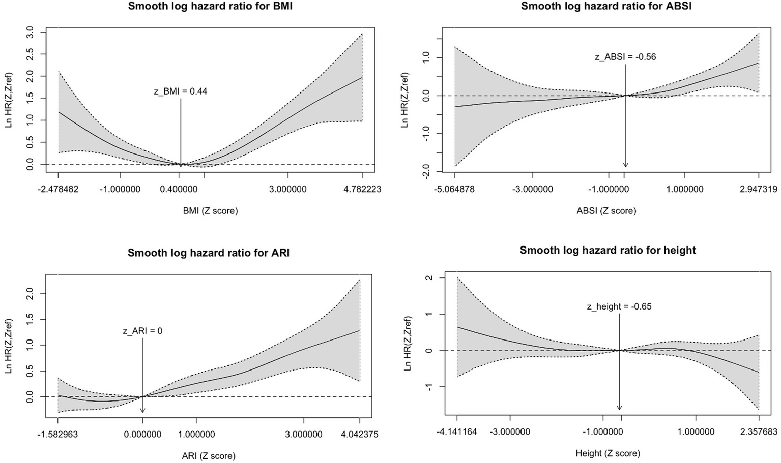 Figure 2. Adjusted smooth HR graphs for mortality. HR plotted against Z scores; Reference line set to mean Z score; ABSI, a body shape index; ARI, anthropometric risk index; BMI, body shape index; adjusted for age, sex, ethnicity, smoking status, SES, and comorbidities.