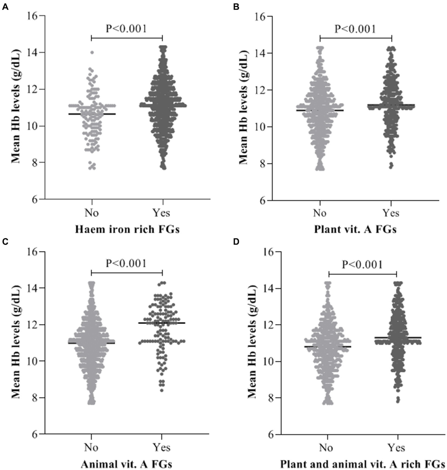 Moreover, the FGs; dark green leafy vegetables, vitamin A-rich fruits and vegetables, Meat (including organ meat), poultry, fish, eggs and milk products were further reclassified as vitamin A-rich plant foods (dark green leafy vegetables, vitamin A-rich fruits and vegetables), vitamin A-rich animal foods (organ meat, eggs and milk products) and foods rich in haem iron (meat, poultry and fish) as per the FAO guidelines (36).