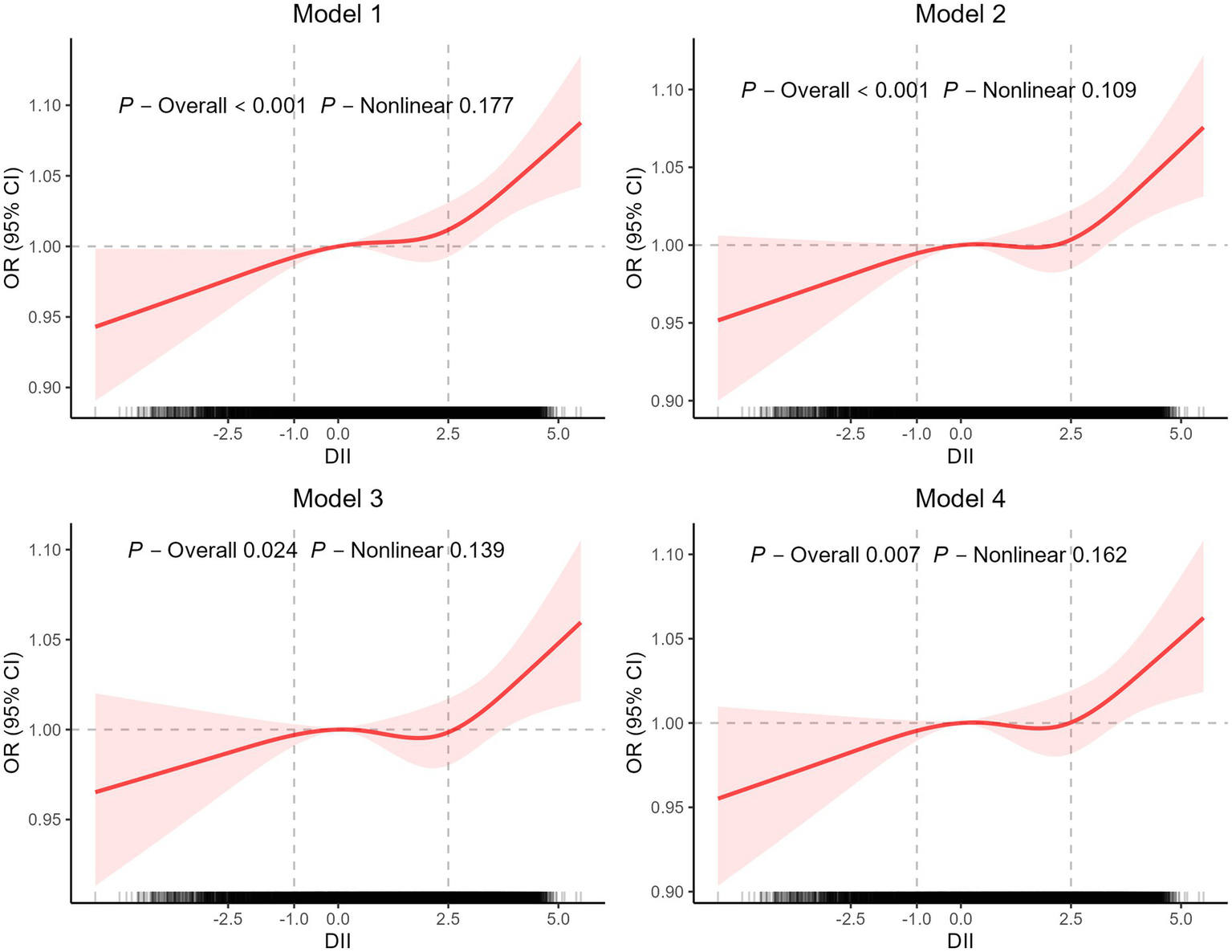 Restricted cubic splines were used to assess the dose–response relationship between GSD and DII scores, using four knots at prespecified locations according to the 5th, 35th, 65th, and 95th DII score percentiles. Subgroup analyzes were conducted using stratified multivariate regression analysis to assess the interaction between DII scores and specific covariates. p values for interactions across subgroups were calculated using the likelihood ratio test.