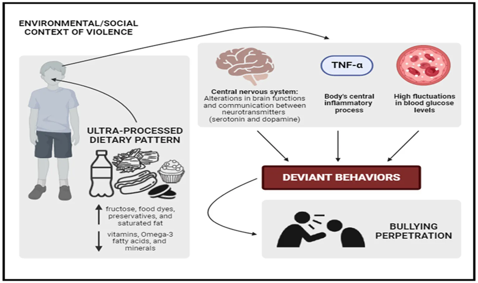 Graphical abstract of the possible mechanisms by which the ultra-processed dietary pattern is associated with the perpetration of bullying. This figure was created using BioRender.com.