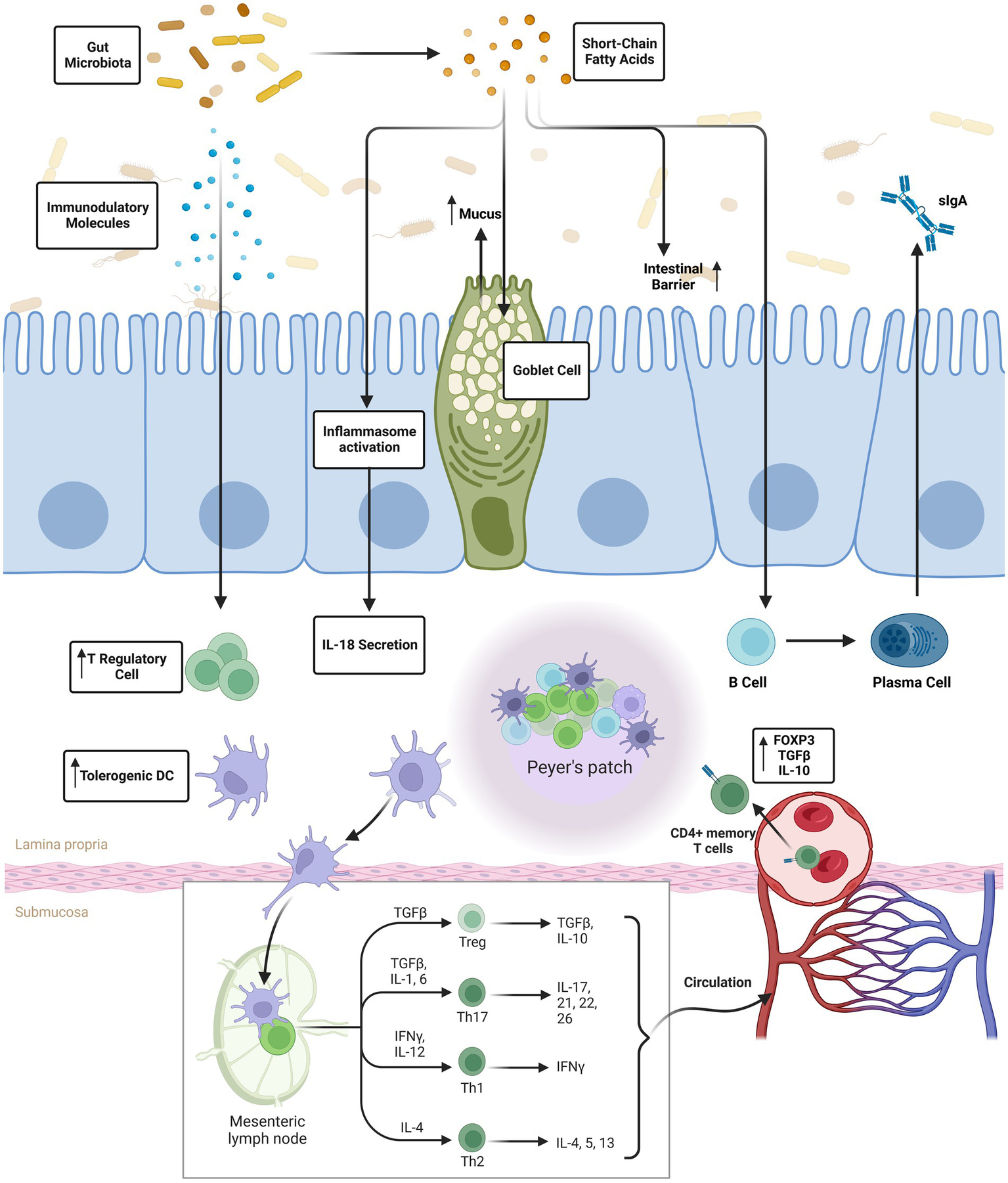 1. Involvement of gut-associated lymphoid tissue (GALT) in immune system development and maturation is regulated by prebiotics, which promotes the growth of beneficial gut bacteria like Bifidobacterial and Lactobacilli. Peyer’s patches and lymphoid follicles are examples of GALT structures that play a crucial role in immune monitoring and the initiation of immunological responses.