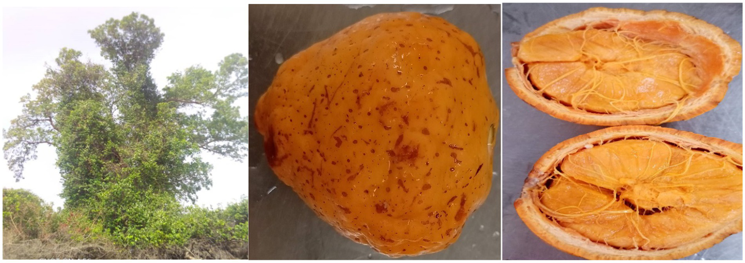 Figure 1. Tree, whole fruit and cross-section of the fruit showing the pulpy seeds for Saba senegalensis fruit.