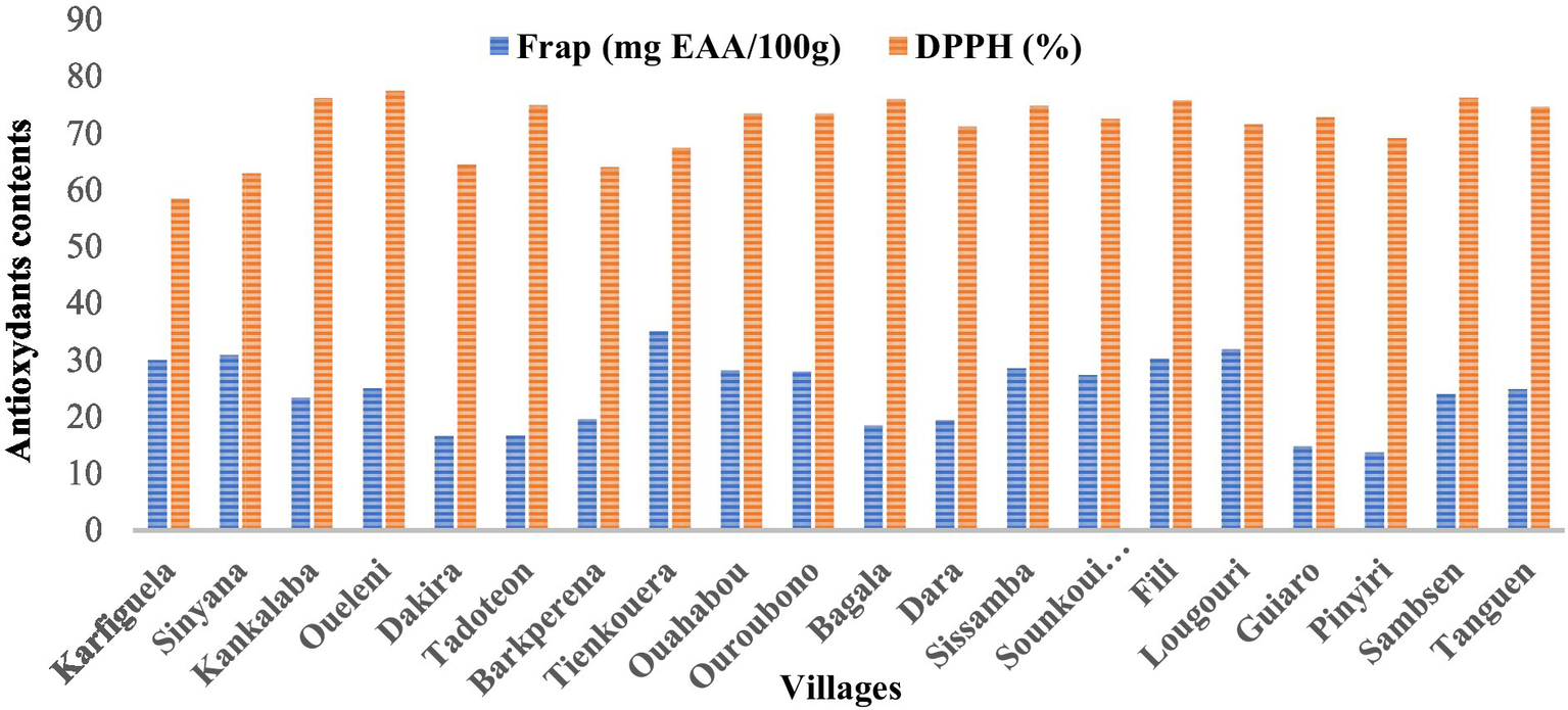 Antioxidant activity (Figure 3) shows a good capacity to reduce the DPPH radical in fruit samples from the region of Sud-Ouest, with the lowest average inhibition (67.63%), and the highest one in the region of Nord (73.62%). As a result, the pulp extract from the region of North has the highest antioxidant capacity compared to the other pulp extracts from the other regions. This was corroborated with ferric reducing activity power (FRAP) which was more marked with samples from the region of Nord with the highest mean value (29.52 mg EAA/100 g FP) and the lowest in the region of Centre-Sud (19.34 mg EAA/100 g FP), showing significant variation according to samples from different villages in the same region and among regions. The variation in the effective concentration of pulp extracts among villages could be explained by the variation in phenolic compound content, which is also influenced by the method of extraction and analysis. Previous studies have shown a correlation between the presence of phenolic compounds in an extract and its antioxidant activity (42). These analyses showed different antioxidant activities, which prove the influence of vegetation conditions, environment, and soil type on the polyphenol content and antioxidant potential of pulps (43).