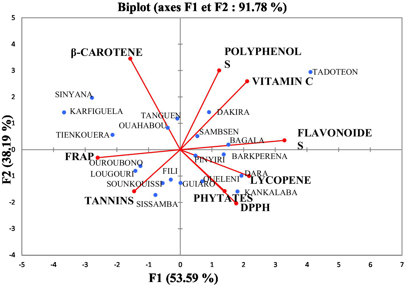 Principal component analysis (PCA) performed based of all the pulp biochemical evaluated variables for the 5 regions (Figure 4). The analysis gives a total inertia percentage of 91.78%, i.e., 53.59% for F1 and 38.19% for F2 of the results. DPPH, phytates, vitamin C, polyphenols, β-carotene and Tannins were well associated on the F1 main axis. FRAP, lycopene, flavonoids parameters are the most represented on the F2 main axis. Significant positive correlations were recorded between total phenolics, flavonoids and vitamin C (Table 3). In addition, these three parameters were negatively correlated with iron reducing power and tannins. Phytates, lycopene and DPPH free radical scavenging capacity were positively correlated with each other, but negatively correlated with carotenes. Data (Table 3) show a very strong positive correlation of 100% between the polyphenols and the tannins, flavonoids and DPPH and FRAP and Phytates. Indeed polyphenols include tannins which are known to have high free radical scavenging properties. Investigations carried out on Saba senegalensis fruit pulps have shown that soil composition has an impact on the bioactive composition of pulps, particularly on polyphenol and tannin content. This results in a large variability in pulp composition from one region to another and from one village to another in the same region. Pulp composition also varies from tree to tree. The Sud-Ouest region (Tadoteon) has the highest levels of bioactive compounds in pulp.