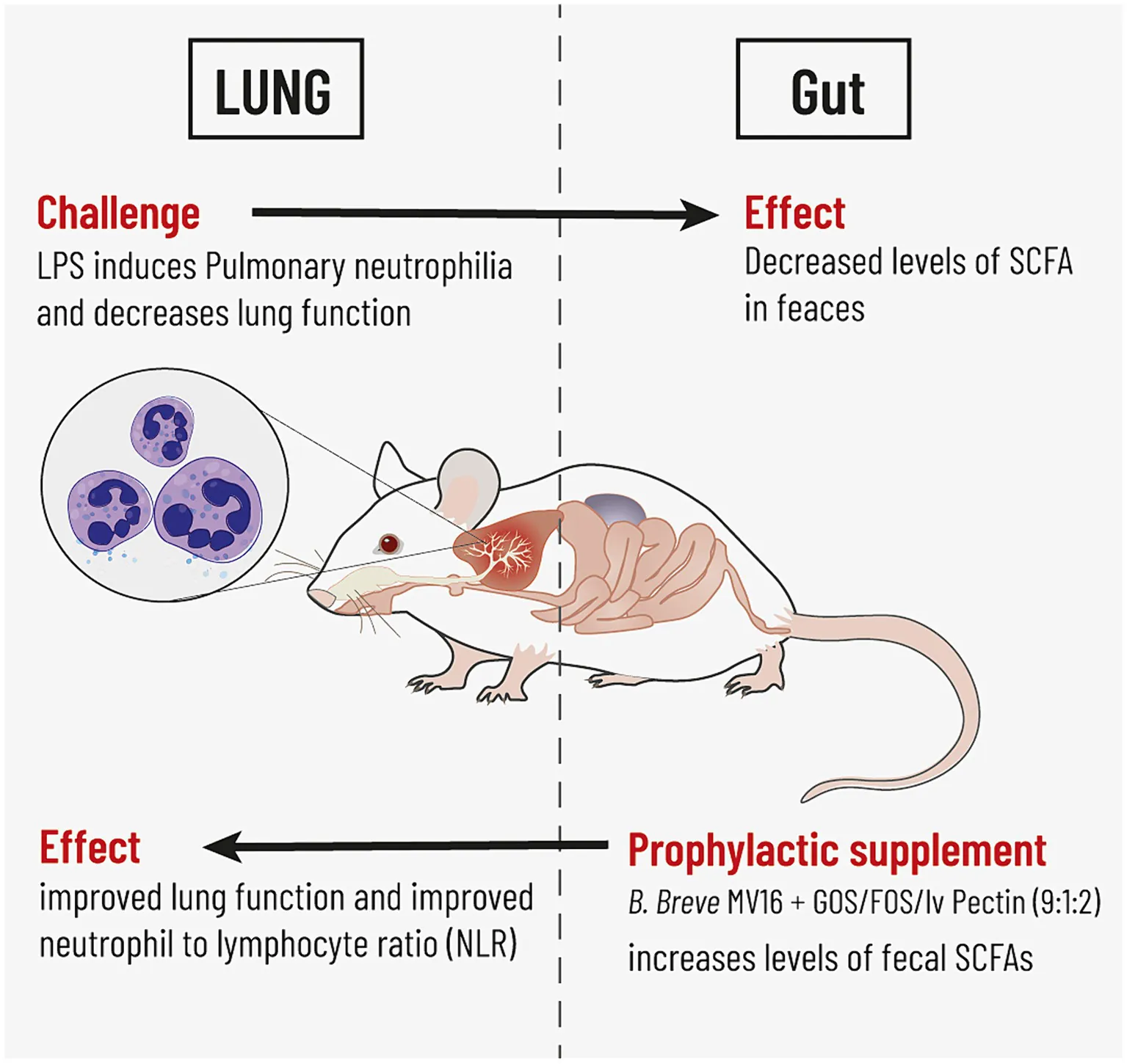This study highlights bidirectional gut lung cross-talk in a mouse model for pulmonary neutrophilia. Repeated pulmonary challenge with LPS induced neutrophilic lung inflammation which was associated with a reduction in levels of fecal SCFA. Intra-gastric supplementation with the synbiotic mixture of B. breve M16-V and GOS:FOS:lvPectin induced enhanced levels of SCFAs and a positive impact on lung health indicated by improved lung function and improved neutrophil to lymphocyte ratio (NLR).