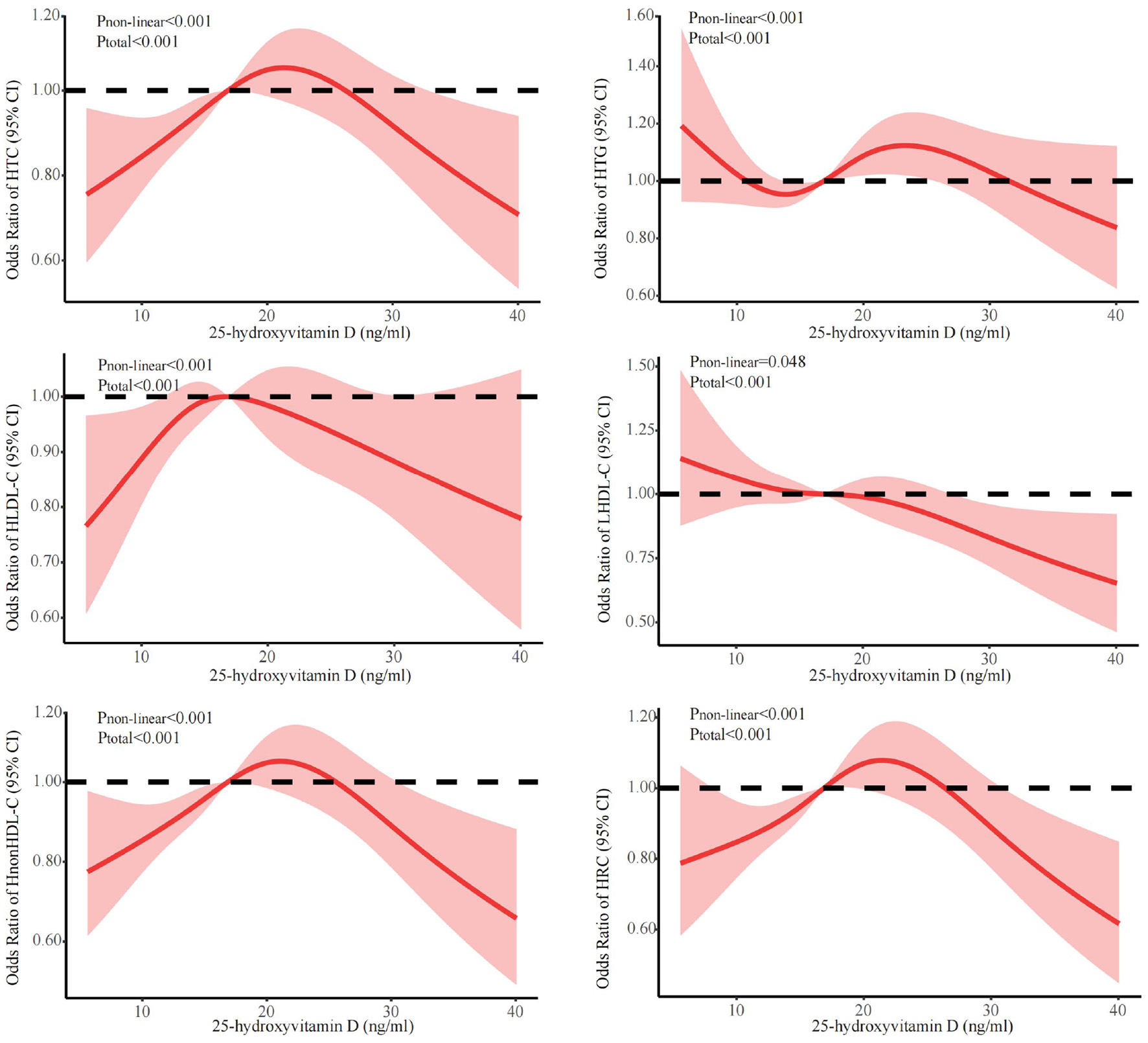 Figure 1. Dose-response relationship between 25(OH)D and lipid profile. Adjusted for covariates including sex (categorical), age (continuous), season (categorical), and BMI (continuous). 25(OH)D, 25-hydroxyvitamin D; CI, confidence interval; HTC, hypercholesterolemia; HTG, hypertriglyceridemia; LHDL-C, hypo-high-density lipoprotein cholesterolemia; HLDL-C, hyper-low-density lipoprotein cholesterol cholesterolemia; HnonHDL, hyper-non-high-density lipoprotein cholesterol; HRC, high remnant cholesterol.