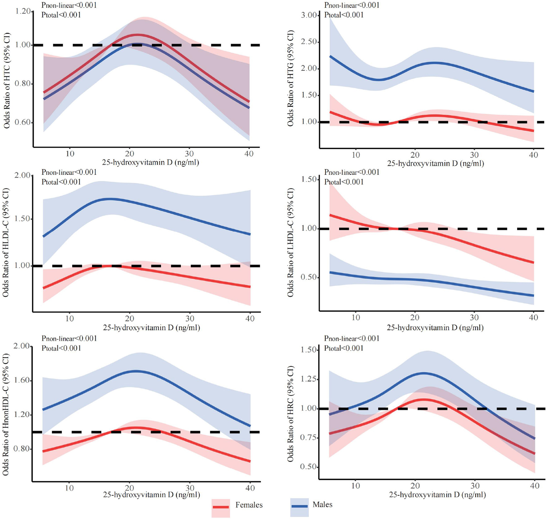 Figure 2. Dose-response relationship between 25-hydroxyvitamin D and the risk for specific dyslipidemias stratified by sex. Adjusted for covariates including sex (categorical), age (continuous), season (categorical), BMI (continuous). CI, confidence interval; HTC, hypercholesterolemia; HTG, hypertriglyceridemia; LHDL-C, hypo-high-density lipoprotein cholesterolemia; HLDL-C, hyper-low-density lipoprotein cholesterol cholesterolemia; HnonHDL-C, hyper-non-high-density lipoprotein cholesterol; HRC, high remnant cholesterol.