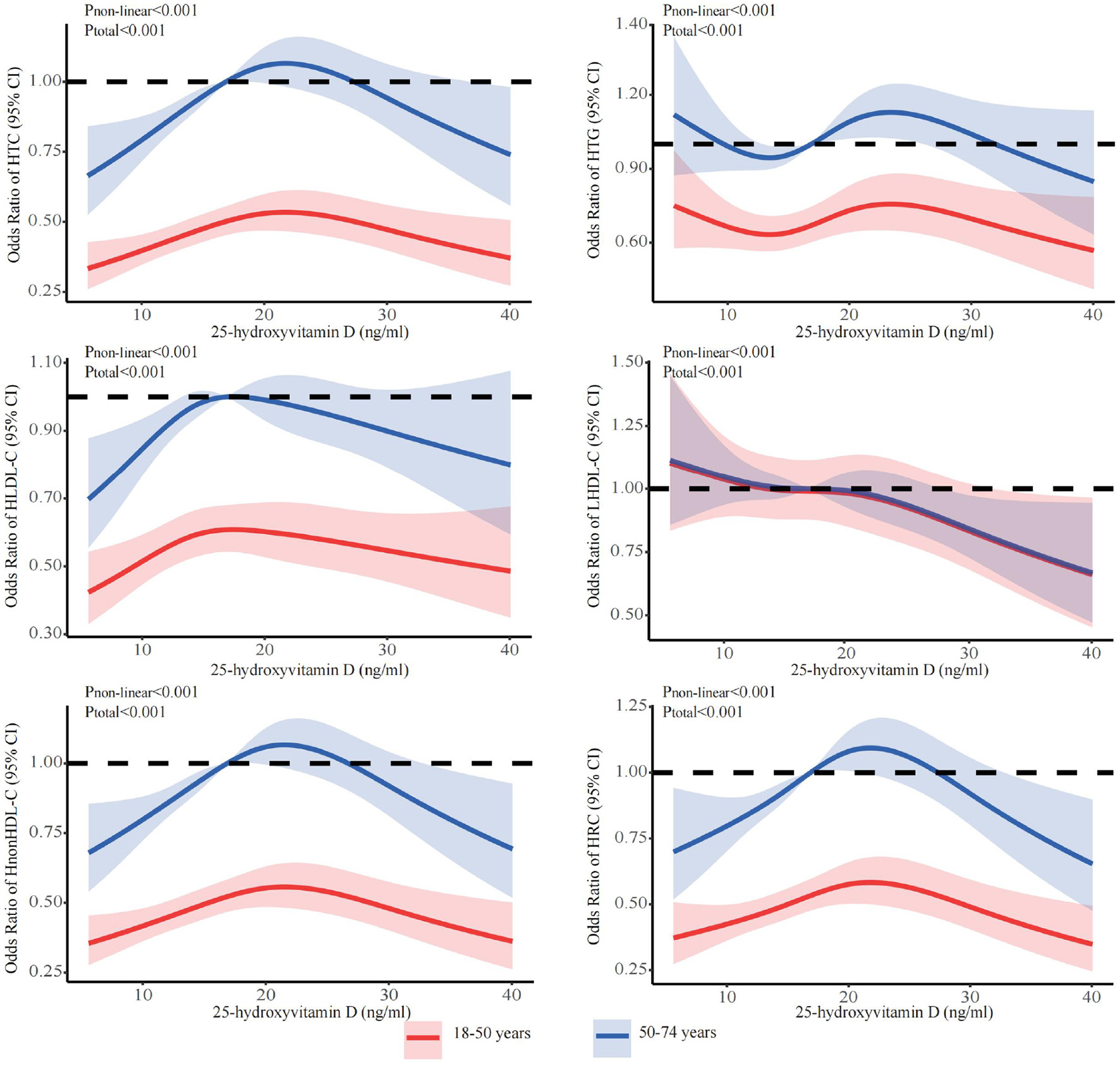 Figure 3. Dose-response relationship between 25-hydroxyvitamin D and the risk for specific dyslipidemias stratified by age. Adjusted for covariates including sex (categorical), age (continuous), season (categorical), BMI (continuous). CI, confidence interval; HTC, hypercholesterolemia; HTG, hypertriglyceridemia; LHDL-C, hypo-high-density lipoprotein cholesterolemia; HLDL-C, hyper-low-density lipoprotein cholesterol cholesterolemia; HnonHDL-C, hyper-non-high-density lipoprotein cholesterol; HRC, high remnant cholesterol.
