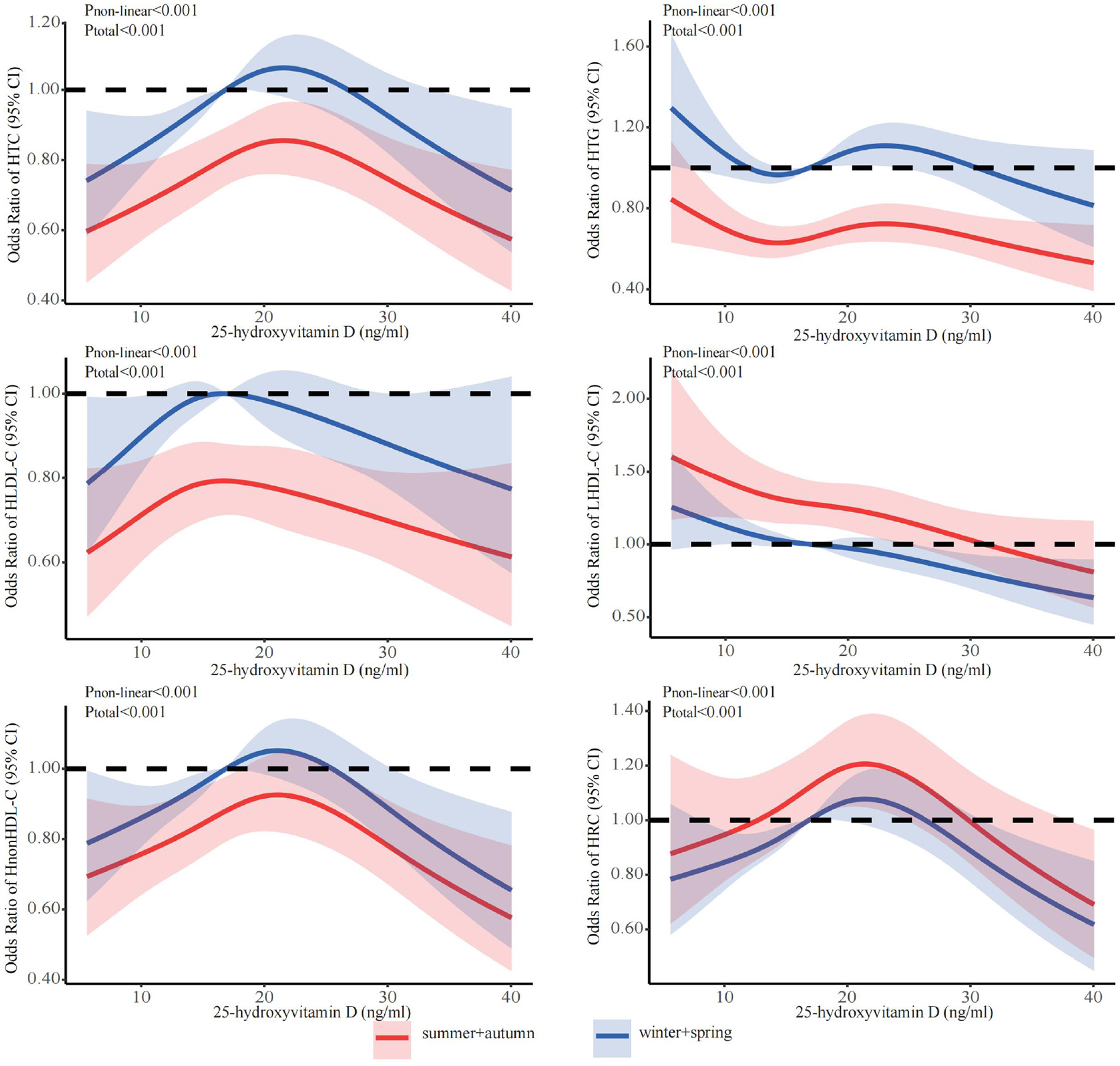 Figure 5. Dose-response relationship between 25-hydroxyvitamin D and the risk for specific dyslipidemias stratified by season. Adjusted for covariates including sex (categorical), age (continuous), season (categorical), BMI (continuous). CI, confidence interval; HTC, hypercholesterolemia; HTG, hypertriglyceridemia; LHDL-C, hypo-high-density lipoprotein cholesterolemia; HLDL-C, hyper-low-density lipoprotein cholesterol cholesterolemia; HnonHDL-C, hyper-non-high-density lipoprotein cholesterol; HRC, high remnant cholesterol.