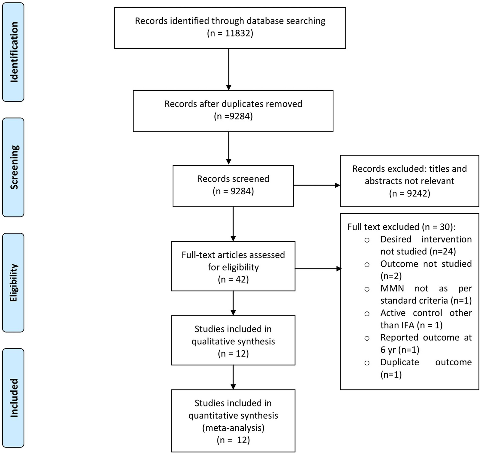 Of the 11,832 total citations retrieved, the full text of 42 articles was assessed for eligibility, and 30 were excluded for various reasons (Figure 1). The reasons were as follows: preconception supplementation of intervention was not studied (not part of ante-natal supplementation) [n = 24], outcomes of interest not studied [n = 2], MMN not as per standard (UNIMMAP) criteria and outcome of interest not studied [n = 1], active control other than IFA [n = 1], reported outcome at 6 years [n = 1], and duplicate outcome reported [n = 1]. Hence, finally, 12 studies [factorial design = 1] with data from 11,391 participants [intervention = 5,824; control = 5,680] were included (10–21).