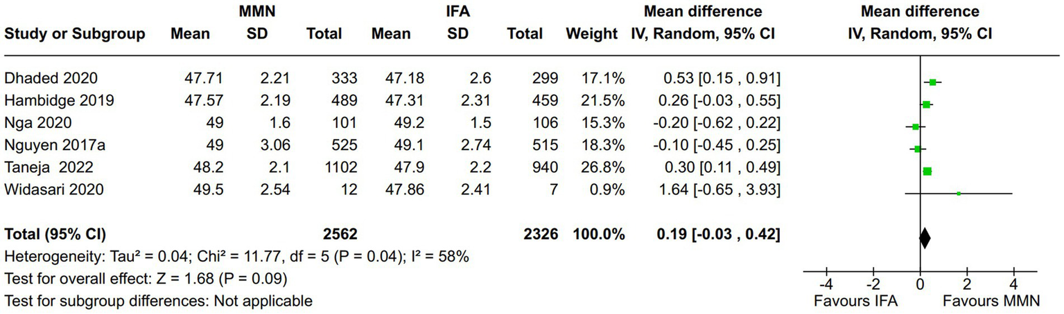 • Six studies reported this outcome (15–18, 20, 21). Two studies provided MMNs as lipid-based formulations (16, 17), and the remaining four studies provided them as non-lipid-based formulations in capsule/tablet form. Data from 4,888 participants were included in the analysis. There was no significant difference in the birth length (cm) between the MMN and control groups [MD, 0.19 (95% CI, −0.03 to 0.42), p = 0.09] (Figure 3). The heterogeneity was significant [I2 = 58%].