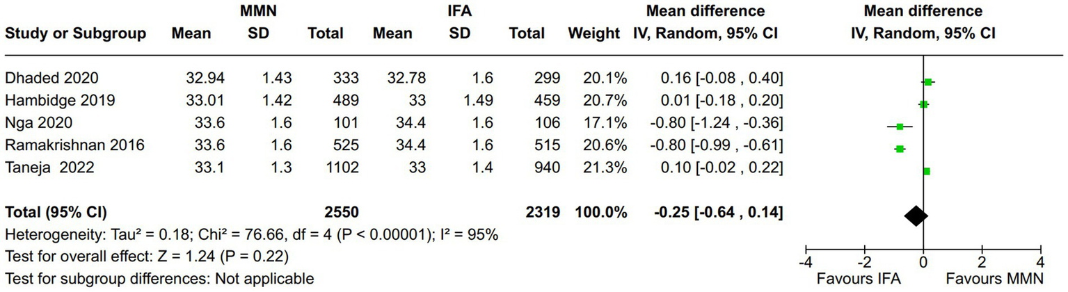 b. Five studies reported this outcome (12, 16–18, 21). Two studies provided MMNs as lipid-based formulations (16, 17), and the remaining four studies provided them as non-lipid-based formulations in capsules/tablet form. Data from 4,869 participants were included in the analysis. There was no significant difference in the head circumference (cm) between the MMN and control groups [MD, −0.25 (95% CI, −0.64 to 0.14), p = 0.22] (Figure 4). The heterogeneity was significant [I2 = 95%].