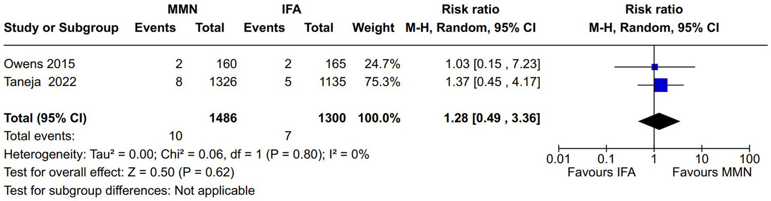 • Maternal death: Two studies reported this outcome (11, 21). Both provided MMNs as non-lipid-based formulations through tablets. Data from 2,786 participants were included in the analysis. There was no significant difference in the maternal death rate between the MMN and control groups [RR, 1.28 (95% CI, 0.49 to 3.36), p = 0.62] (Figure 7). There was no heterogeneity [I2 = 0%].