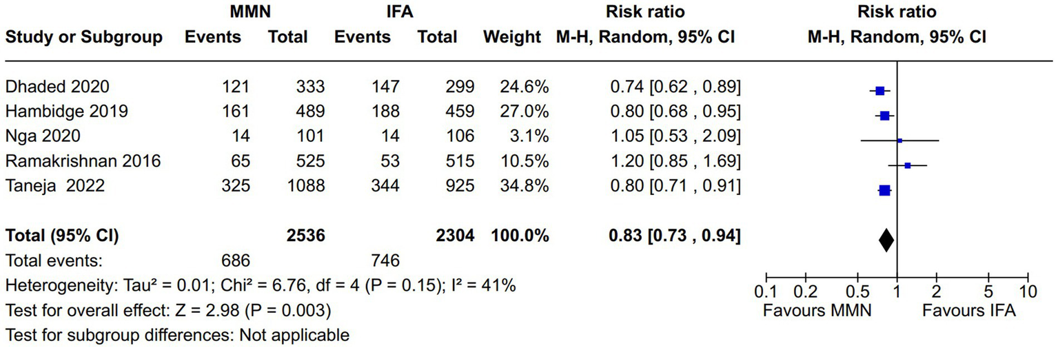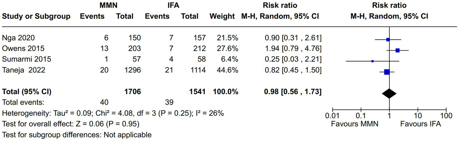 b. Maternal anemia: Two studies reported this outcome (13, 21). Both provided MMNs as non-lipid-based formulations through capsules/tablets. Data from 2,746 participants were included in the analysis. There was no significant difference in the maternal anemia rate between the MMN and control groups [RR, 0.96 (95% CI, 0.88 to 1.05), p = 0.42] (Figure 6). There was no heterogeneity [I2 = 0%].