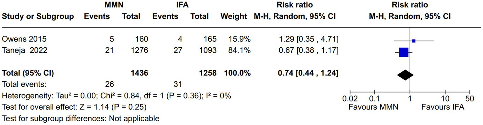 Neonatal death: Two studies reported this outcome (11, 21) (Figure 12). These studies provided MMNs as tablets. Data from 2,694 participants were included in the analysis. There was no difference between the MMN and control groups [RR, 0.74 (95% CI, 0.44 to 1.24), p = 0.25]. There was no heterogeneity [I2 = 0%].
