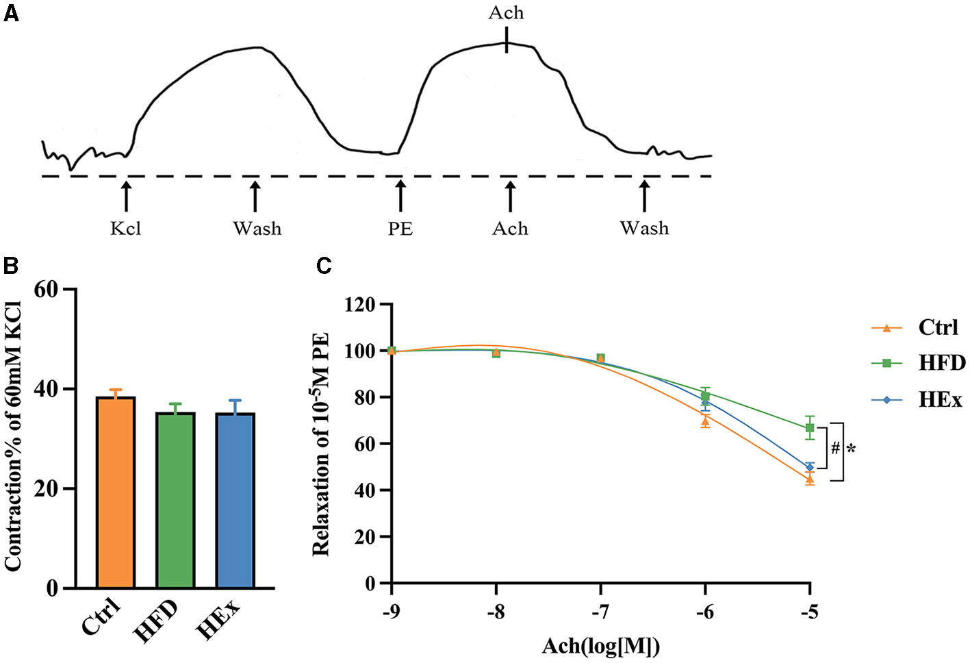 Figure 1. The effects of aerobic exercise on vasoconstriction and vasodilation in rats fed with a high-fat diet. (A) Representative trace showing aortic ring reaction in response to different treatments. (B) Quantitative analysis of systolic tension in aortic rings containing PVAT (n = 6–7). (C) ACh-induced vasodilatory response in aortic rings containing PVAT (n = 6–7). The data are presented as mean ± SEM. The results are significant compared to the control group (*p < 0.05) and the HFD group (#p < 0.05).