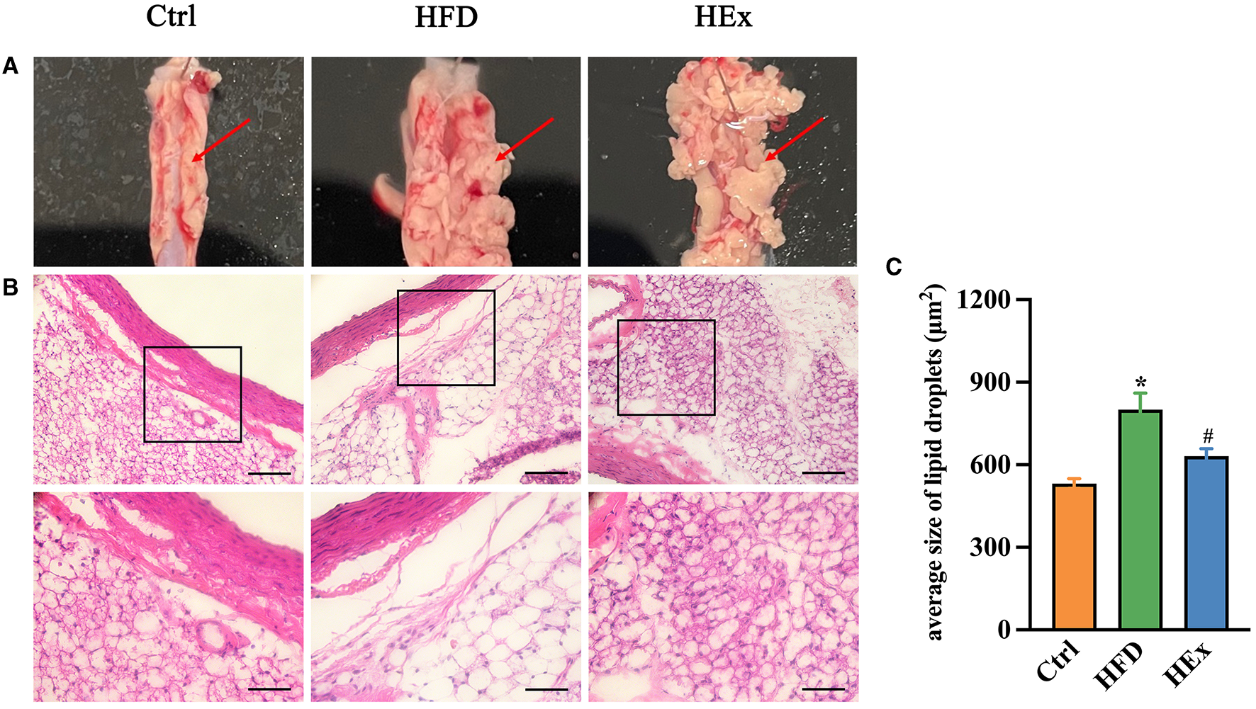 Figure 2. Analysis of the characteristics of PVAT. (A) Morphology of PVAT in thoracic aortic segments of rats. (B) Representative images of H&E staining of aorta PVAT (n = 6). Digital images were captured using 20X and 40X magnification (middle and lower panels). Scale bar = 100/50 μm. (C) Quantified data showing the average size of lipid droplets in PVAT (n = 6). The data are presented as mean ± SEM. The results are significant compared to the control group (*p < 0.05) and the HFD group (#p < 0.05).