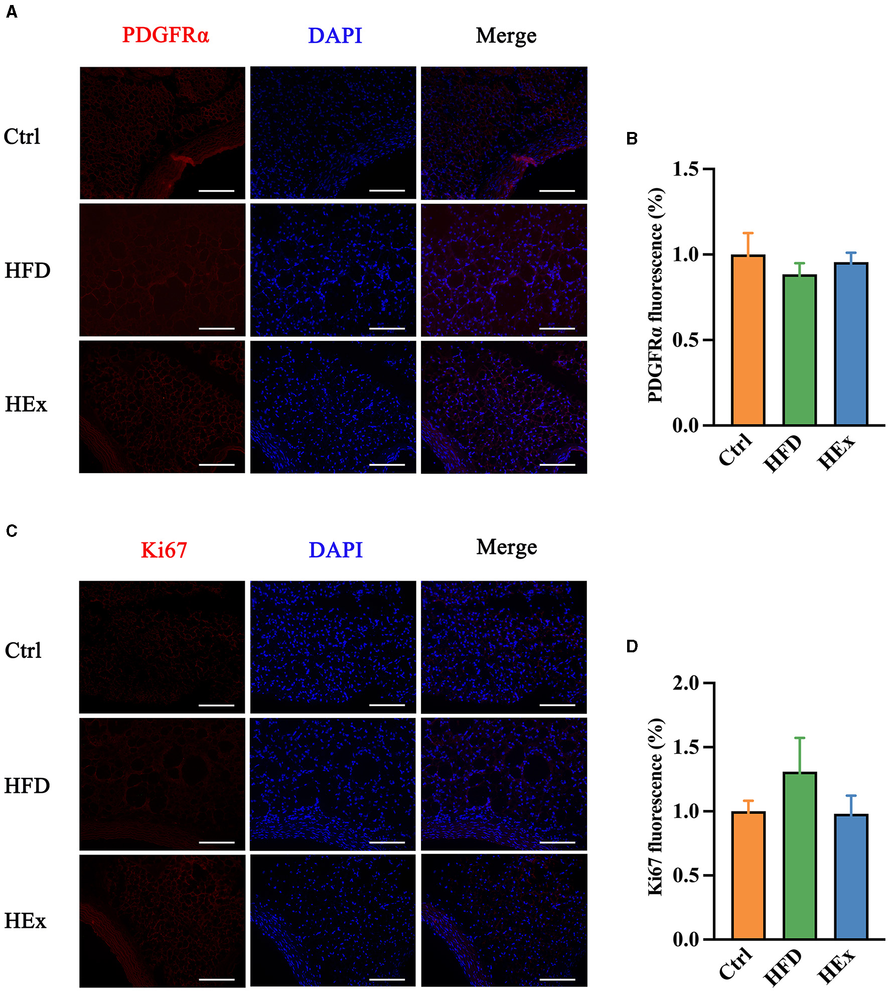 Figure 5. Effects of aerobic exercise on proliferation of ASPCs in PVAT. (A, C) Representative images showing positive staining for PDGFRα and Ki67. Scale bar: 100 μm. Red: PDGFRα or Ki67; blue: nuclei counterstained with DAPI. (B) PDGFRα fluorescence was quantified and presented as a histogram (n = 6–7). (D) Ki67 fluorescence was quantified and presented as a histogram (n = 6). The data are presented as mean ± SEM.