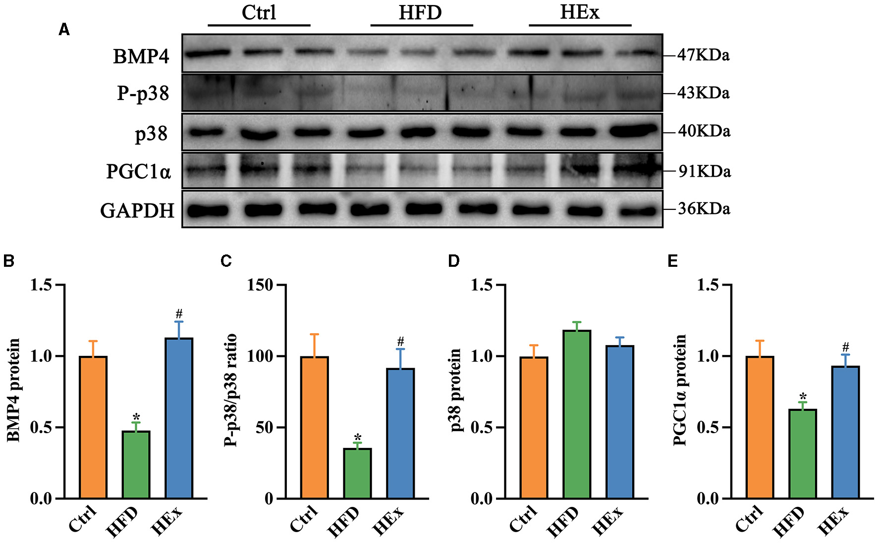 Figure 7. Effects of aerobic exercise on the BMP4 signaling pathway in PVAT of rats fed with a high-fat diet. (A) Representative Western blot images of BMP4, P-p38, p38, PGC1α, and internal control GAPDH in PVAT. (B–E) Protein levels of BMP4, P-p38/p38, p38 and PGC1α (n = 6). The data are presented as mean ± SEM. The results are significant compared to the control group (*p < 0.05) and the HFD group (#p < 0.05).