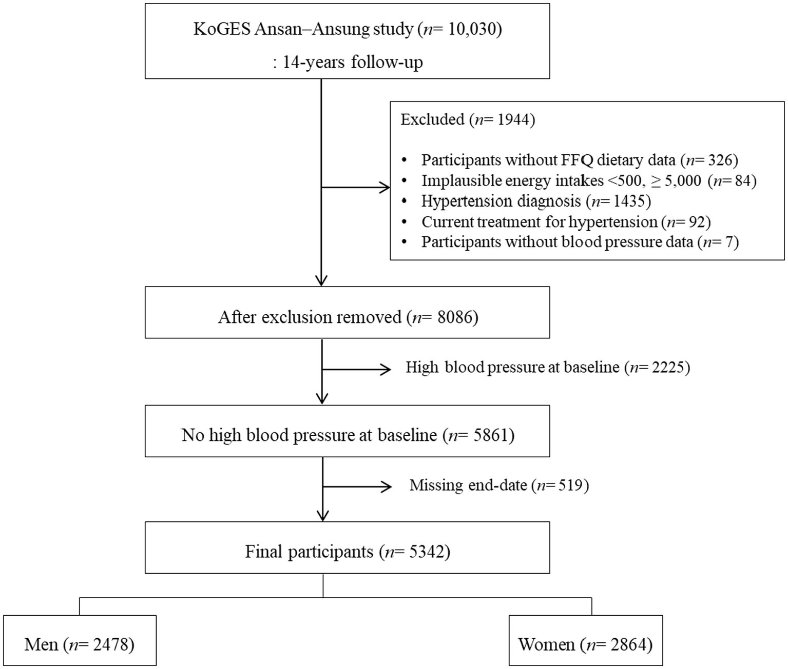 Among the 10,030 participants, the following subjects were excluded from this study: those with missing dietary data (n = 326), with a daily calorie intake <500 kcal or ≥ 5,000 kcal (n = 84), diagnosed with hypertension (n = 1,435), having current treatment for hypertension (n = 92), and those without systolic blood pressure (SBP) and diastolic blood pressure (DBP) measurements (n = 7). Lastly, those with HBP at baseline (n = 2,225) and missing end-date (n = 519) were excluded. As a result, a final sample of 5,342 participants (2,478 males, 2,864 females) formed our study population.