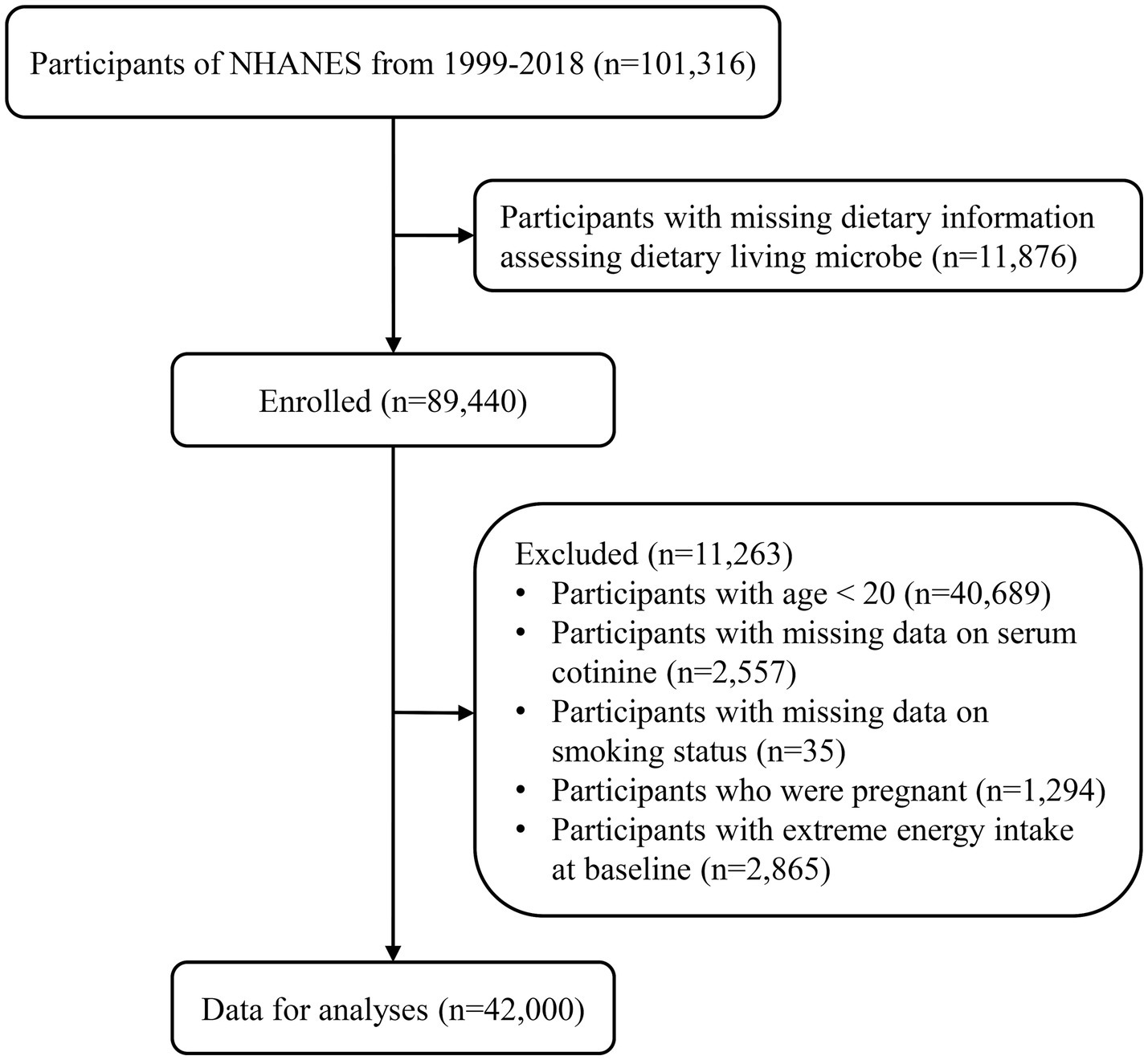 We collected data and characteristics of 101,316 participants from NHANES between 1999 and 2018, following NHANES sample weight guidelines.2 Participants with missing data assessing dietary live microbe intake (n = 11,876) were excluded. Additionally, individuals aged less than 20 (n = 40,689), those with missing serum cotinine data (n = 2,557), missing smoking status data (n = 35), pregnant individuals (n = 1,294), and those with extreme energy intake at baseline (n = 2,865) were excluded. In total, 42,000 eligible participants were included in the final analyses. Detailed information on the sample selection procedure is displayed in Figure 1.