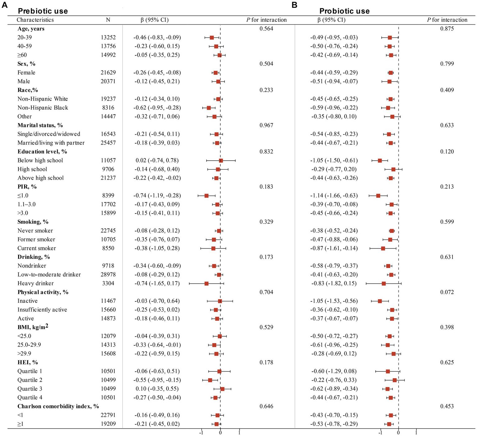 Figure 2. Stratified analyses of the associations of non-dietary prebiotic (A) and probiotic (B) intake with serum cotinine levels among adults in NHANES 1999–2018. Analyses were adjusted for covariates age (20–39, 40–59, or ≥ 60), sex (male or female), race/ethnicity (Non-Hispanic White, Non-Hispanic Black or Other), marital status (married/living with partner, or single/divorced/widowed), education level (below high school, high school, or above high school), family PIR (≤1.0, 1.1–3.0, or > 3.0), drinking status (nondrinker, former drinker, or current drinker), BMI (<25.0, 25.0–29.9, or > 29.9), physical activity (inactive, insufficiently active, or active), HEI (in quartiles), and Charlson comorbidity index (continuous), and smoking status (never smoker, former smoker, or current smoker) when they were not the strata variables.