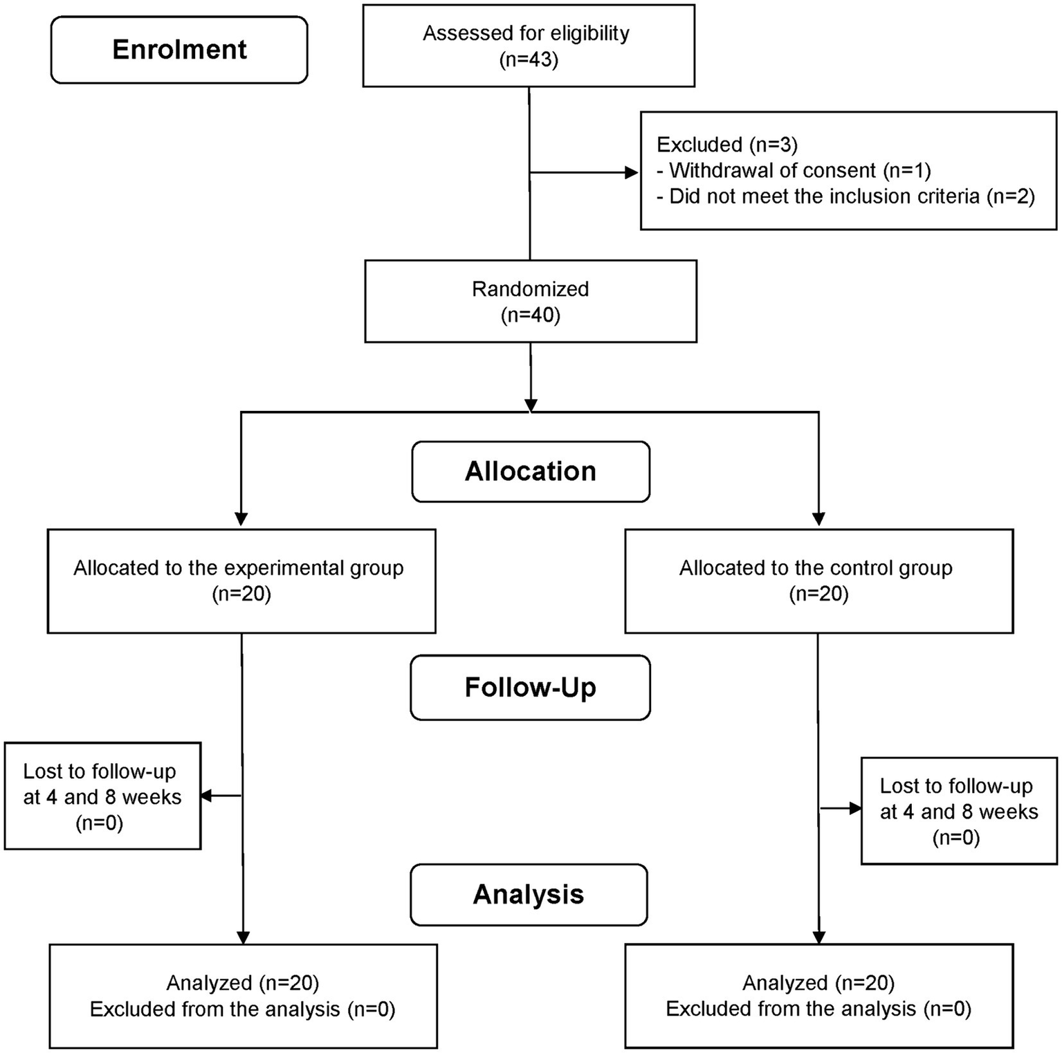 This study, conducted between November 2022 and May 2023, involved adults aged 30–59 years who reported that they experienced sleep disturbances. The choice of the age group in our study was based on several considerations. While it is true that life events such as having young children or experiencing menopause can significantly affect sleep patterns, we aimed to focus on a broad adult population. In the case of the elderly, sleep problems may manifest differently due to aging. By selecting the age range of 30 to 59 years, we aimed to capture a diverse group of individuals who are likely to encounter various life events and stressors. To exclude individuals with severe sleep disturbances, the study only included individuals with a Pittsburgh Sleep Quality Index (PSQI) score of >5 points and an Insomnia Severity Index (ISI) score of ≥8 but ≤21 points. The eligibility criteria for the participants are presented in Supplementary Table S1. The sample size was calculated as 40 (20 each in the experimental and control groups), considering a 10% dropout rate. In accordance with a previous study, the sample size was estimated based on the following statistical parameters: an assumed statistical power of 80%; a significance level (α) of 0.05 for two-sided, two-sample, equal variance t-tests; a difference of 2.4 in the amount of change in PSQI scores between the LTC-022 and placebo groups; and a standard deviation of 2.5 (24). A total of 43 participants were registered for screening. Two participants were excluded owing to a PSQI score < 5 and an ISI score > 21, and one participant withdrew their consent before randomization. Therefore, 40 participants were included in the randomization step (Figure 1). Data on experimental adjuvants administered to participants were collected at baseline and at weeks 4 and 8.