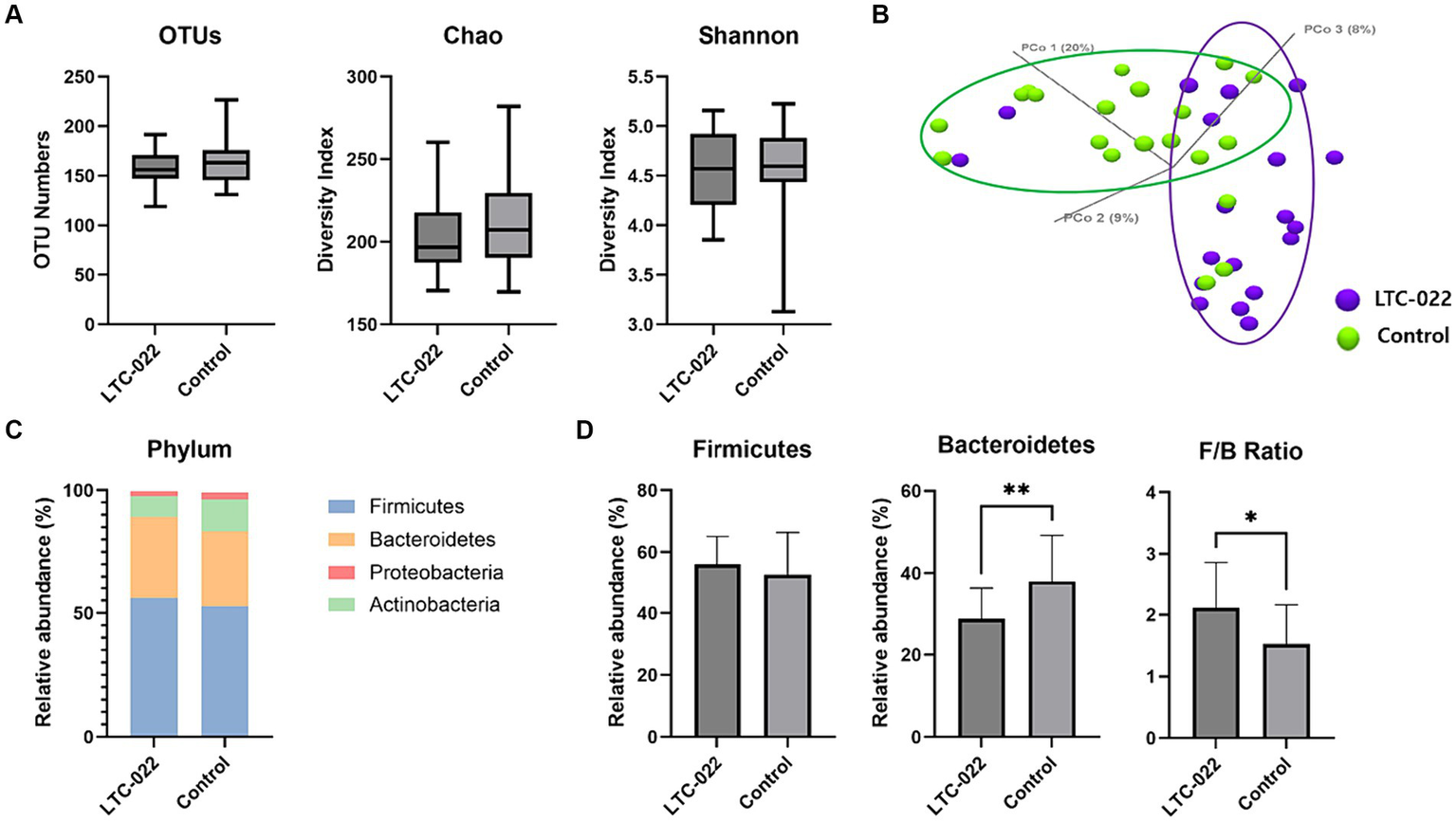 All stool samples contained five phyla: Firmicutes, Bacteroidetes, Actinobacteria, and Proteobacteria (each had a relative abundance <1%) (Figure 2C). Among them, Firmicutes and Bacteroidetes constituted the majority (Figure 2D). Significant differences were observed in the Firmicutes/Bacteroidetes (F/B) ratio and abundance of Bacteroidetes between the LTC-022 and control groups.