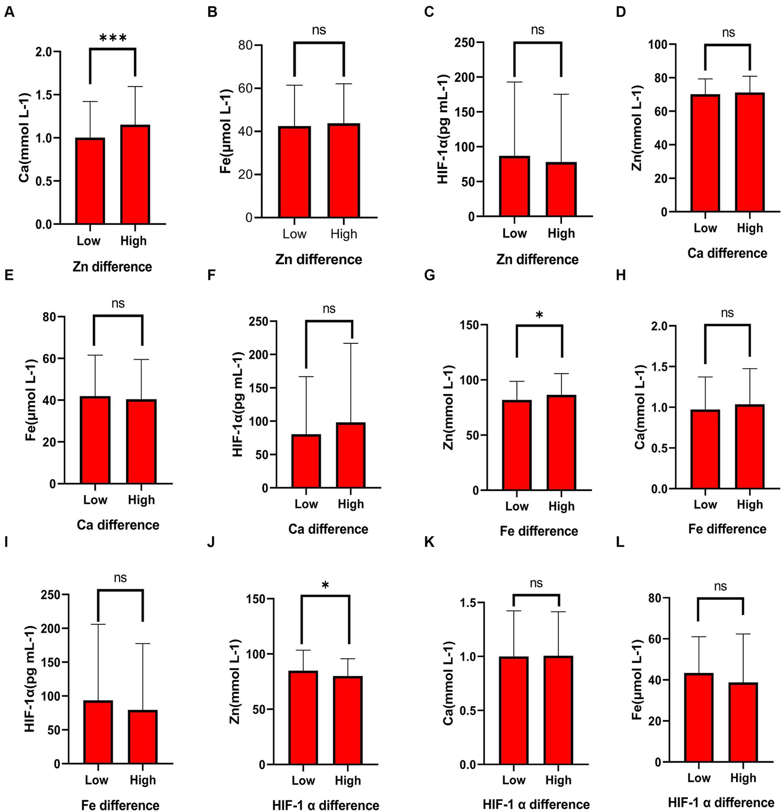 Figure 2. The differential expression of common elements (Zn, Fe, Ca) and HIF-1α in different concentration groups. (A) The expression of Ca in the high Zn concentration group and the low Zn concentration group. (B) The expression of Fe in the high Zn concentration group and the low Zn concentration group. (C) The expression of HIF-1α in the high Zn concentration group and the low Zn concentration group. (D) The expression of Zn in the high Ca concentration group and the low Ca concentration group. (E) The expression of Fe in the high Ca concentration group and the low Ca concentration group. (F) The expression of HIF-1α in the high Ca concentration group and the low Ca concentration group. (G) The expression of Zn in the high Fe concentration group and the low Fe concentration group. (H) The expression of Ca in the high Fe concentration group and the low Fe concentration group. (I) The expression of HIF-1α in the high Fe concentration group and the low Fe concentration group. (J) The expression of Zn in the high HIF-1α concentration group and the low HIF-1α concentration group. (K) The expression of Ca in the high HIF-1α concentration group and the low HIF-1α concentration group. (L) The expression of Fe in the high HIF-1α concentration group and the low HIF-1α concentration group. “*” indicates a p-value less than 0.05, “**” indicates a p-value less than 0.01, “***” indicates a p-value less than 0.001, and “ns” indicates no statistical significance.