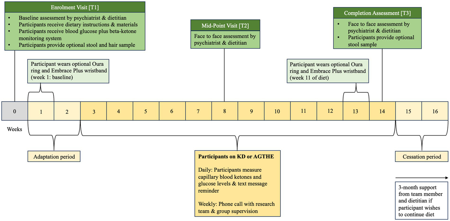 Pre-existing psychiatric and metabolic treatment will continue as per the treating team’s medical advice. Metabolic medication might be adjusted for those in the KD group in collaboration with their physician to minimize the risk of hypoglycemia. Participants in both groups will be given a blood ketone and glucose monitoring device at the end of the enrolment visit (T1) and instructed to take a daily capillary blood sample to measure glucose and ketone levels. The measurement will occur consistently every day, 2 h before their routine dinner time. Daily glucose and ketone measurements are uploaded to a team’s database daily and strictly monitored to detect any emergent metabolic abnormality.