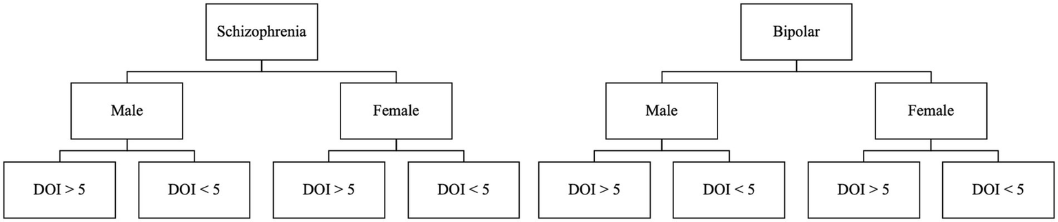 For this study, stratified randomization will be used. We will stratify by assuming eight groups based on the following criteria: diagnosis (schizophrenia or bipolar disorder), gender (male or female), and duration of illness (DOI; more or less than 5 years). Groups will be divided as demonstrated in Figure 2.