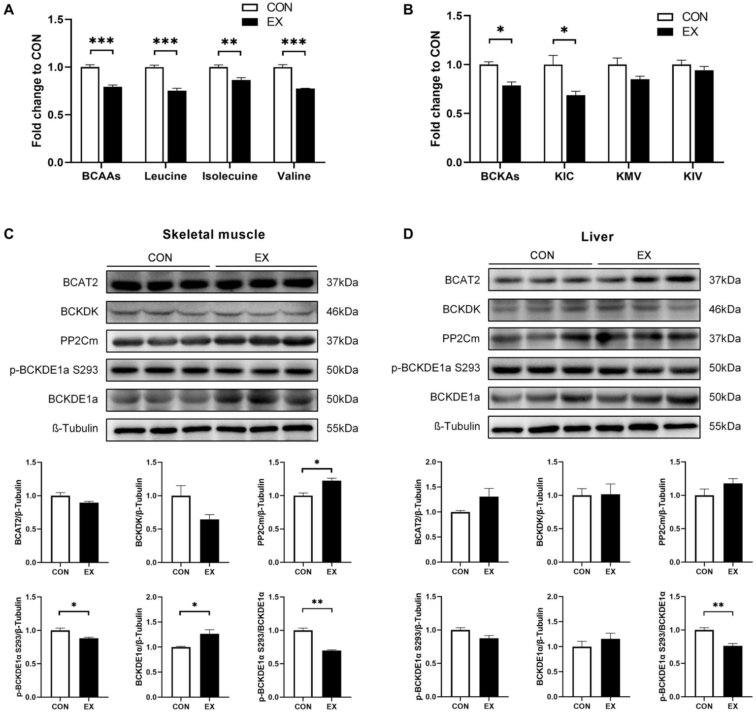 Effect of 12-week aerobic exercise on plasma BCAAs (A) and BCKAs (B) levels, and BCAAs catabolic protein expression in skeletal muscle (C) and liver (D). *p < 0.05, **p < 0.01, ***p < 0.001. BCKA, branched-chain keto acids; KIC, α-ketoisocaproic acid; KMV, α-keto-β-methylvaleric acid; KIV, α-ketoisovaleric acid.