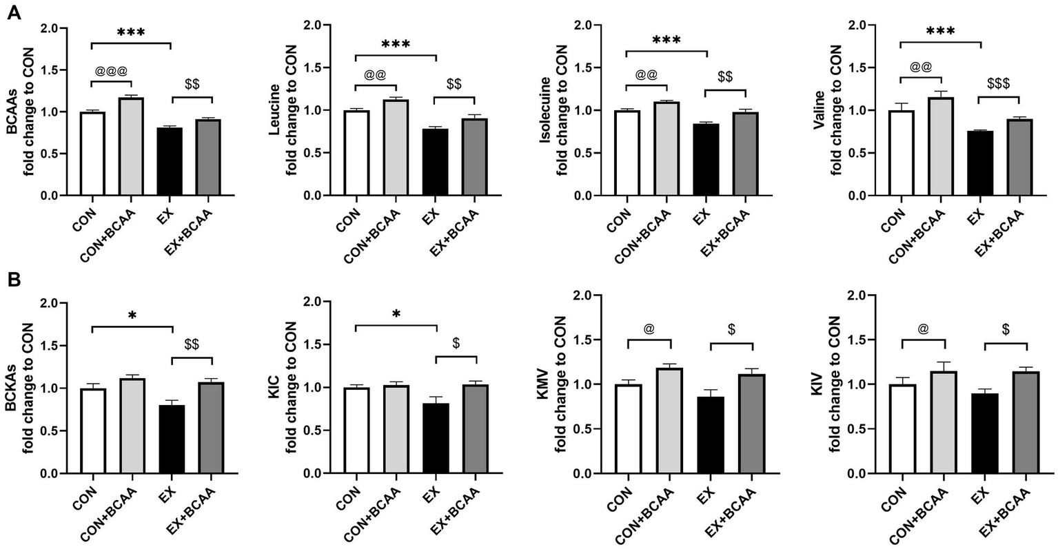 Effect of exercise intervention and BCAAs supplementation on plasma BCAAs (A) and BCKAs (B) (relative to CON group). *p < 0.05, ***p < 0.001, @p < 0.05, @@p < 0.01, @@@p < 0.001, $p < 0.05, $$p < 0.01, $$$p < 0.001. BCKA, branched-chain keto acids; KIC, α-ketoisocaproic acid; KMV, α-keto-β-methylvaleric acid; KIV, α-ketoisovaleric acid.