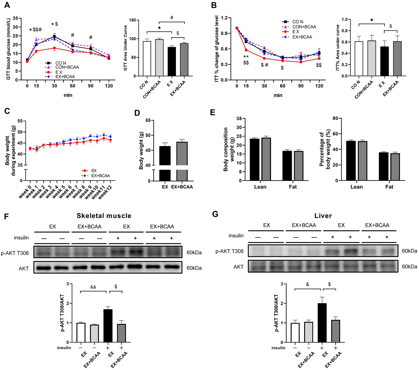 Effect of exercise intervention and BCAAs supplementation on glucose tolerance test (A), insulin tolerance test result (B), the change of body weight during 12-week of exercise (C), body weight after 12-week of exercise (D) and body composition (E), and phosphorylation of AKT T308 in skeletal muscle (F) and liver (G). *p < 0.05, #p < 0.05, &p < 0.05, &&p < 0.01, $p < 0.05.