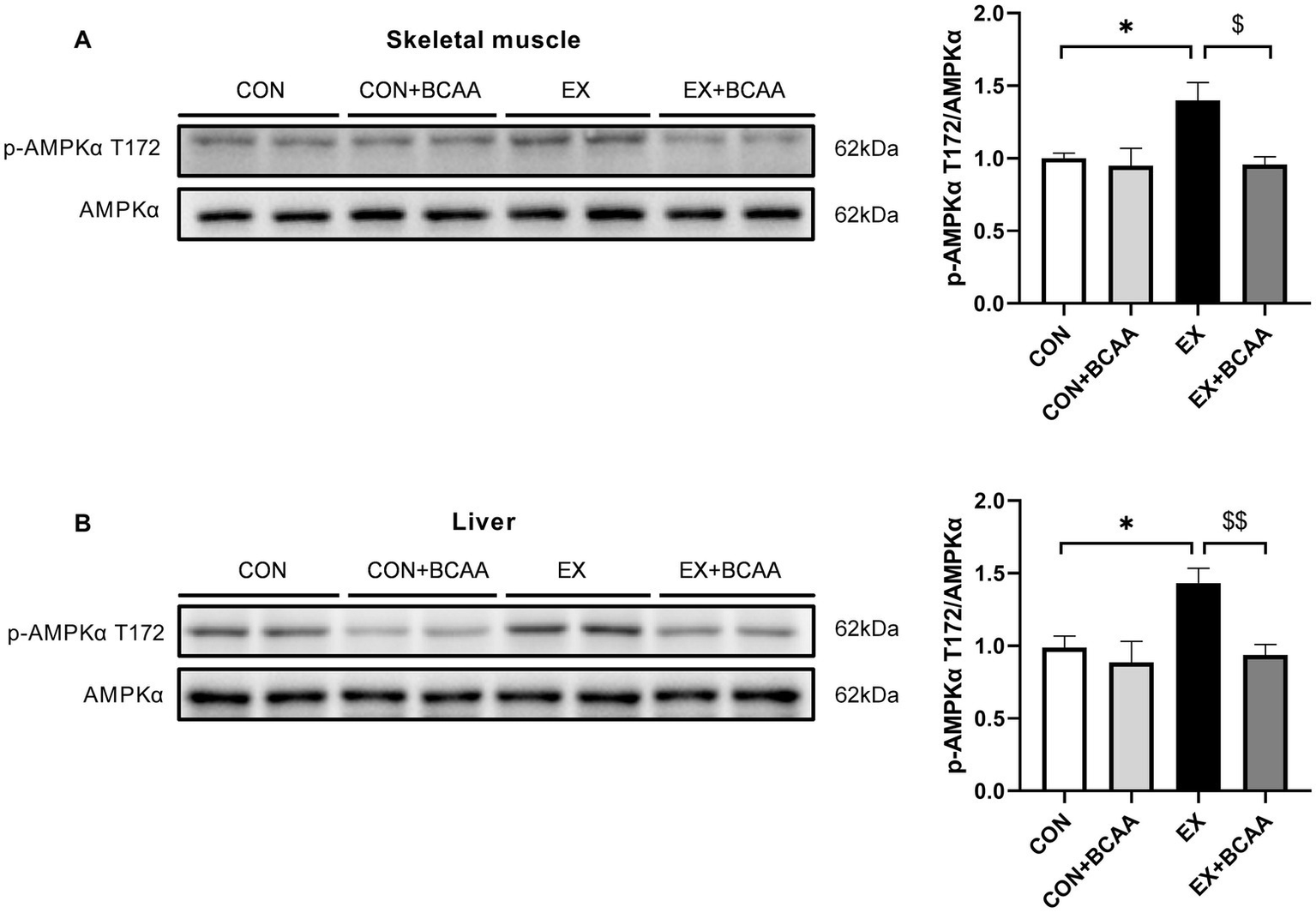 Effect of exercise intervention and BCAAs supplementation on the phosphorylation of AMPKα T172 in skeletal muscle (A) and liver (B). **p < 0.01, $p < 0.05, $$p < 0.01.