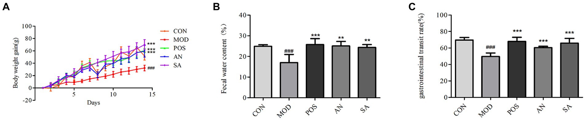 Dry stool is common in constipation, and the water content of feces can be used to determine the successful establishment of the constipation model and the severity of constipation. Increased fecal water content indicates the increase of intestinal peristalsis, which could relieve symptoms of constipation. The fecal water content of MOD rats was decreased (17.01 ± 3.99) on the 14th day of constipation induction, which was significantly lower than that in the CON rats (24.88 ± 0.68, p < 0.05) (Figure 1B). However, after treatment, the feces moisture content of rats in the POS (25.75 ± 2.89), AN (25.09 ± 2.19), and SA (24.39 ± 1.35) groups was significantly increased compared to the MOD group (p < 0.05).