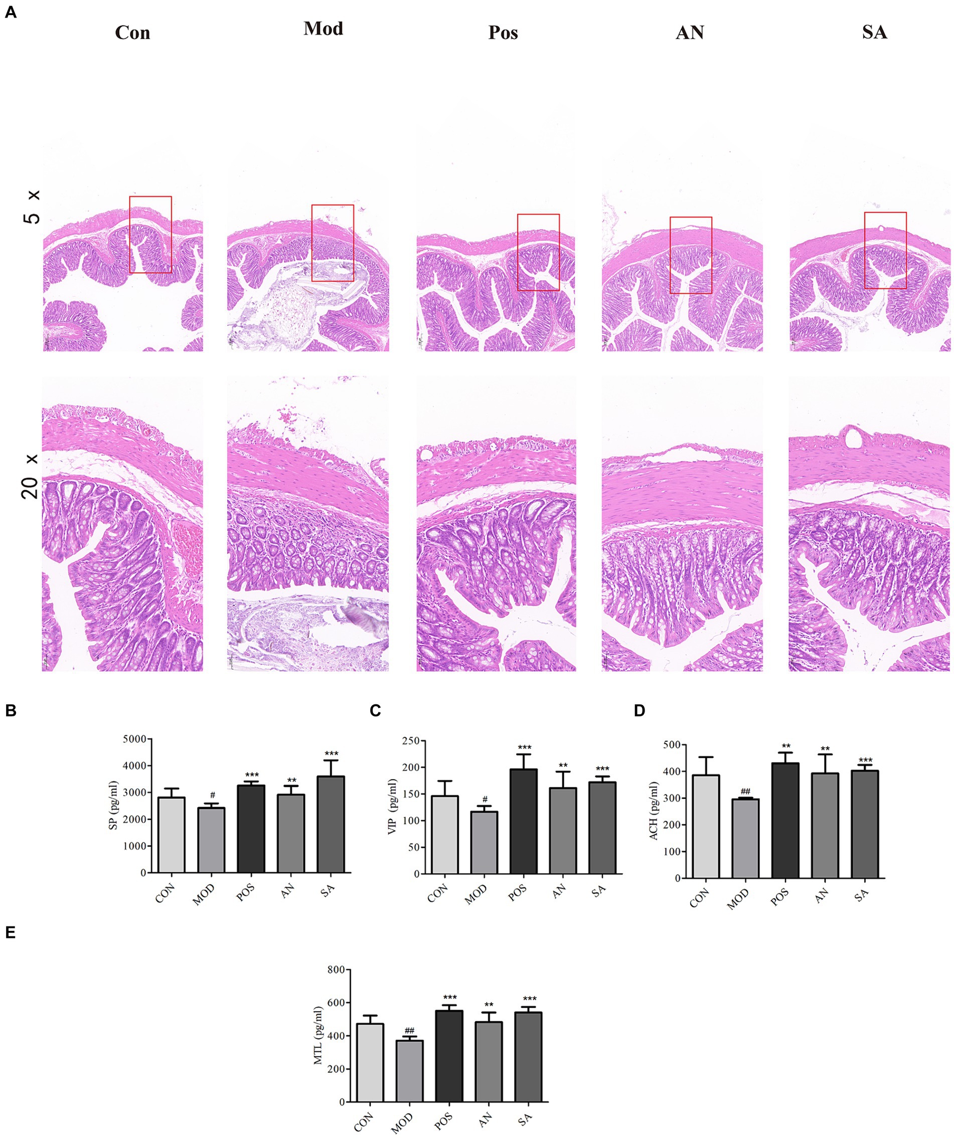 Figure 2. H&E staining of rat’s colon tissues (magnification = 5× and 20×). (A). Levels of substance P (SP) (B), vasoactive intestinal peptide (VIP) (C), acetylcholine (ACh) (D), and motilin (MTL) (E) in rat serum. Data are displayed as mean ± SD. #p < 0.05 and ##p < 0.01 vs. CON group. *p < 0.05, **p < 0.01, and ***p < 0.001 vs. MOD group.