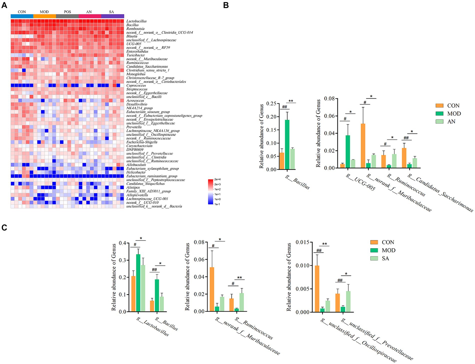 Figure 3. AN and CAN alter microbial composition at the genus levels. (A) Community heatmap at the genus level. (B) Relative abundance of Bacillus, UCG-005, norank_f_Muribaculaceae, Ruminococcus, and Candidatus_Saccharimonas before and after AN treatment. (C) Relative abundance of Lactobacillus, Bacillus, norank_f_Muribaculaceae, Ruminococcus, unclassified_f_Oscillospiraceae, and unclassified_f_Prevotellaceae before and after CAN treatment. Data are displayed as mean ± SD. #p < 0.05, ##p < 0.01, and ###p < 0.001 vs. CON group. *p < 0.05, **p < 0.01, and ***p < 0.001 vs. MOD group.