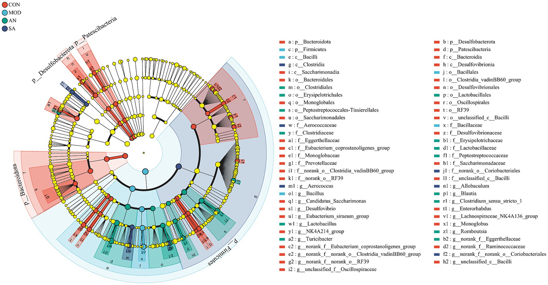 The characteristic bacteria and biomarkers in each group were further identified by LEfSe analysis, which revealed significant differences in intestinal microbiota at various levels in different groups (Supplementary Figure S3, LDA score >3.5). At the phylum level (Figure 4), the predominant bacteria in the CON group were Bacteroidetes, Desulfobacteria, and Patescibacteria, while in the MOD group was Firmicutes. At the class level, the CON group biomarkers included Eggerthellaceae, Desulfovibrionaceae, Eubacterium_coprostanoligenes_group, Monoglobaceae, Provotellaceae, norank_o_Clostridia_vadinBB60_group, Saccharimonadaceae, norank_o_RF39, and unclassified_c_Bacilli. Whereas that of the MOD group was Bacillaceae. In addition, g_norank_f_Eggerthellaceae, g_Lactobacillus, g_Turicibacter, g_Clostridium_sensu_stricto_1, g_Romboutsia, and g_Blautia were identified as the main biomarkers for the AN group, potentially serving as specific targets modified by AN on the intestinal microbiota. For the SA group, g_norank_f_norank_o_Coriobacteriales, g_Allobaculum, g_Aerococcus, and c_Clostridia were identified as specific targets.