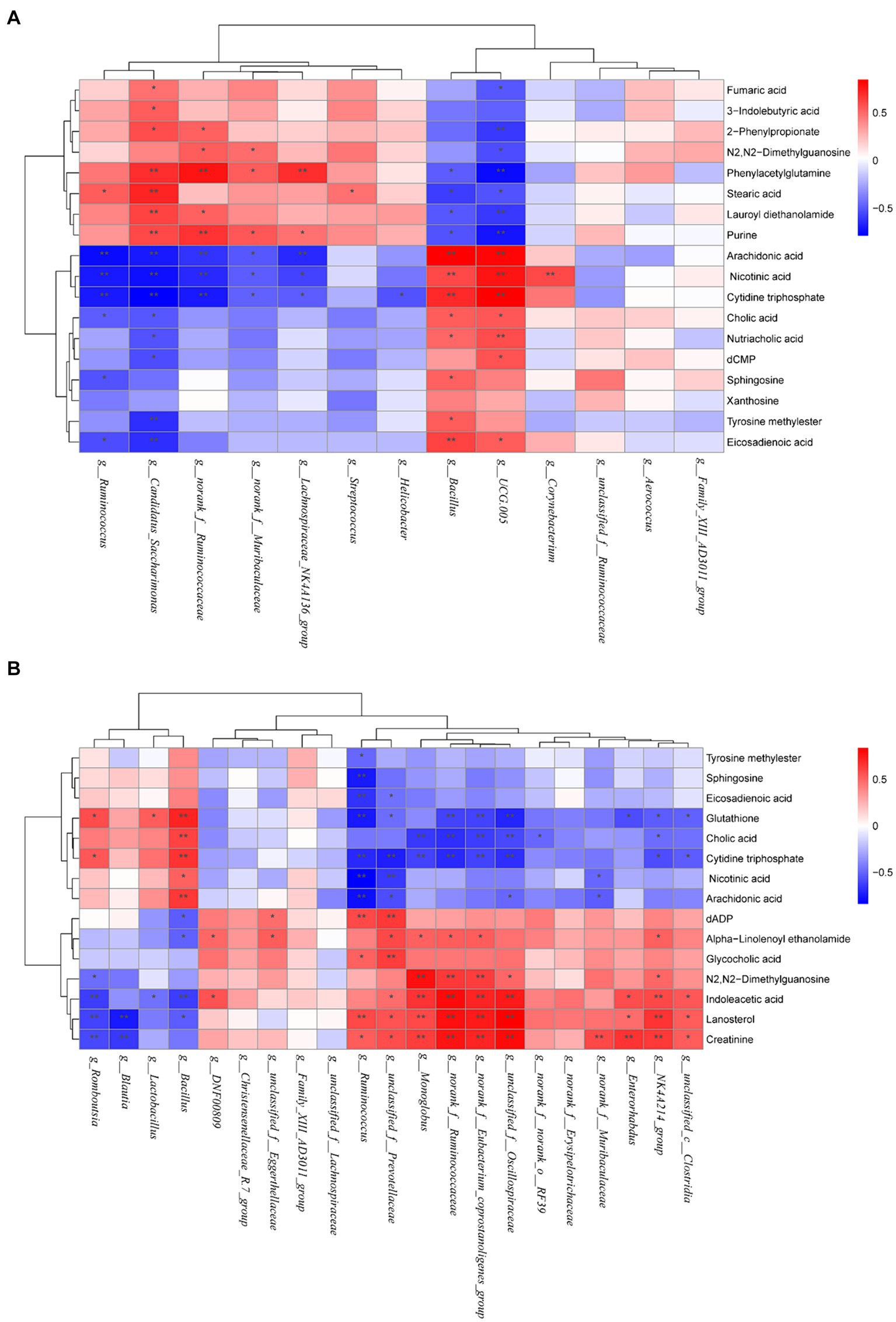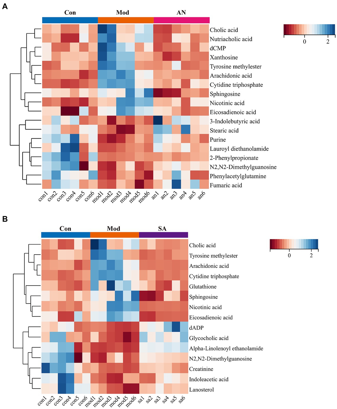 Figure 8. Heatmaps of correlation between gut microbiota and differential metabolites in (A) CON, MOD, and AN groups as well as (B) in CON, MOD, and SA groups. Red represents positive correlation; blue represents negative correlation, and the darker the color, the greater the correlation coefficient. *p < 0.05 and **p < 0.01.