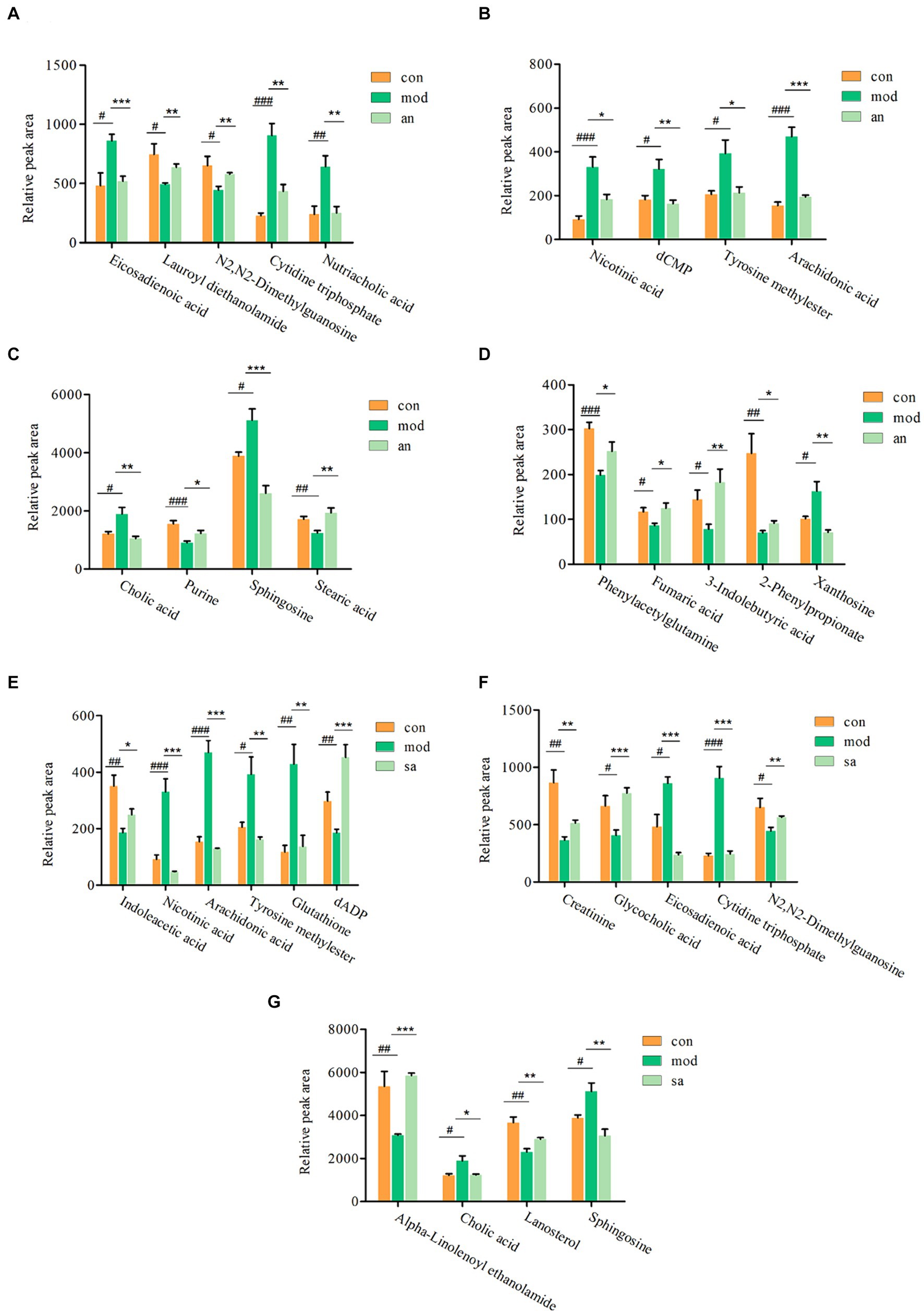 Figure 6. The ionic strength of potential metabolites in rat feces (A–G). Data are displayed as mean ± SD. #p < 0.05, ##p < 0.01, and ###p < 0.001 vs. CON group. *p < 0.05, **p < 0.01, and ***p < 0.001 vs. MOD group.