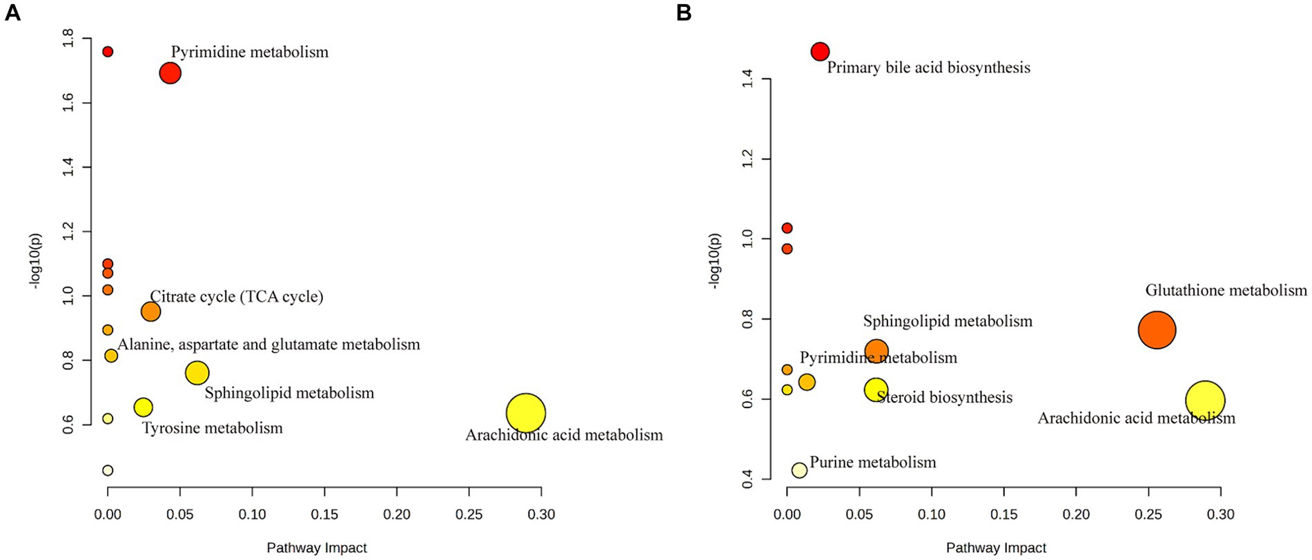 The identified metabolites were imported into the MetaboAnalyst database for potential metabolic pathway analysis. The data revealed that AN-treated metabolites were associated with arachidonic acid, sphingolipid, pyrimidine, tyrosine, alanine, aspartate, and glutamate metabolisms, as well as TCA cycle (Figure 7A). Whereas the CAN-treated metabolites were associated with arachidonic acid, glutathione, sphingolipid, pyrimidine, and purine metabolisms, as well as steroid and primary bile acid biosynthesis (Figure 7B). Among these, arachidonic acid, sphingolipid, and pyrimidine metabolisms were metabolic pathways regulated by both AN and CAN.